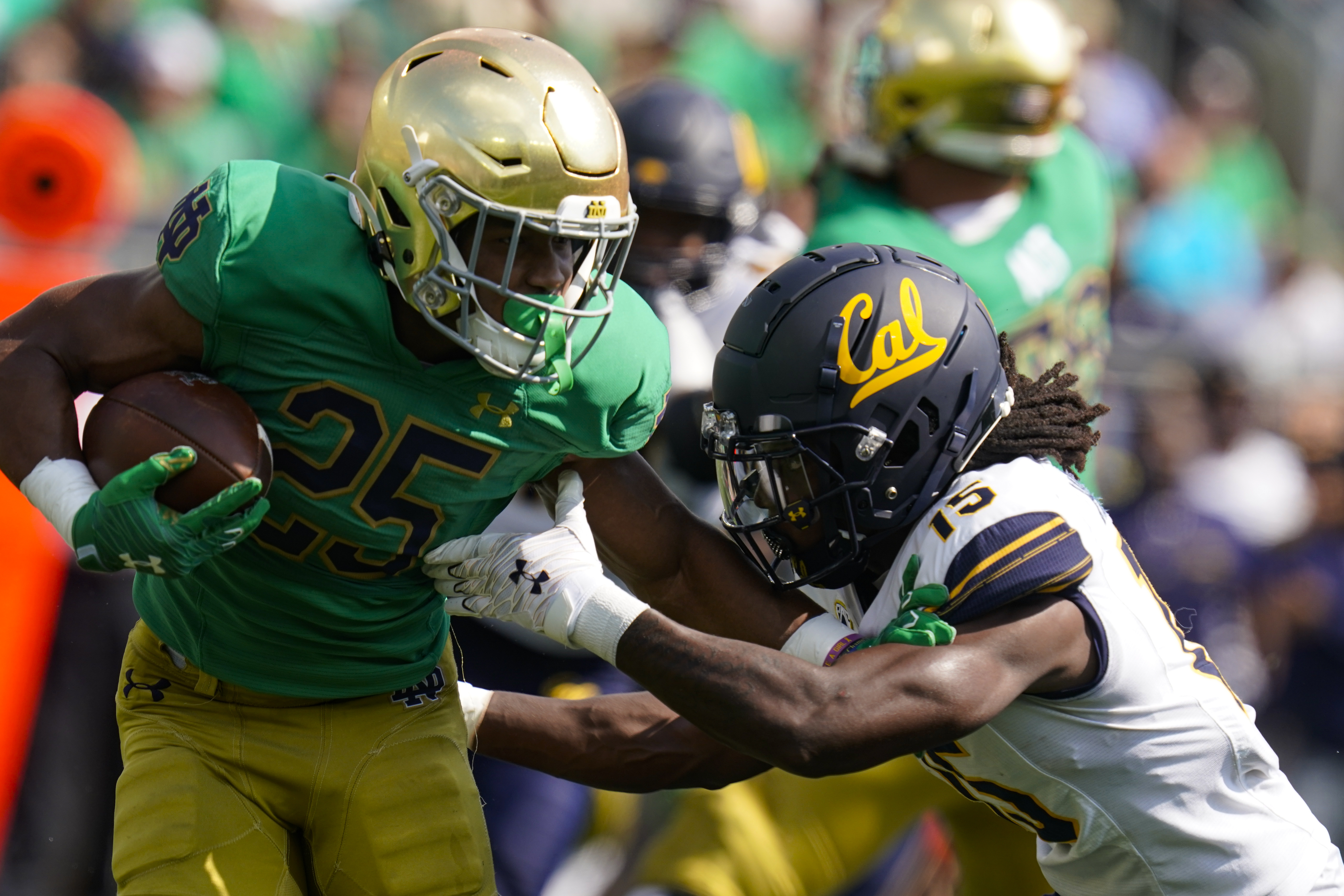 Notre Dame running back Chris Tyree (25) tries to hold off the tackle of California cornerback Lu-Magia Hearns III (15) during the first half of an NCAA college football game in South Bend, Ind., Saturday, Sept. 17, 2022. (AP Photo/Michael Conroy)