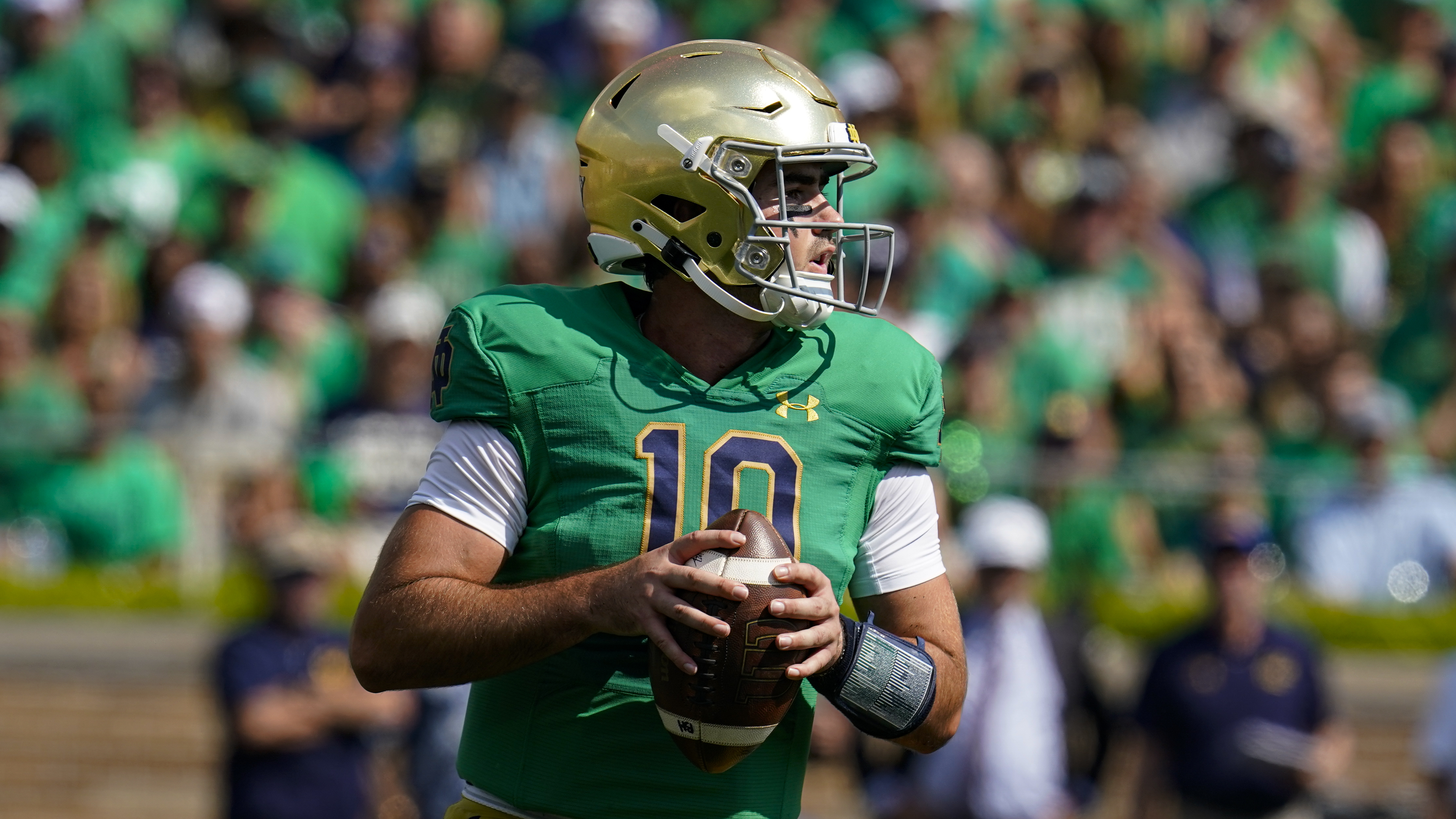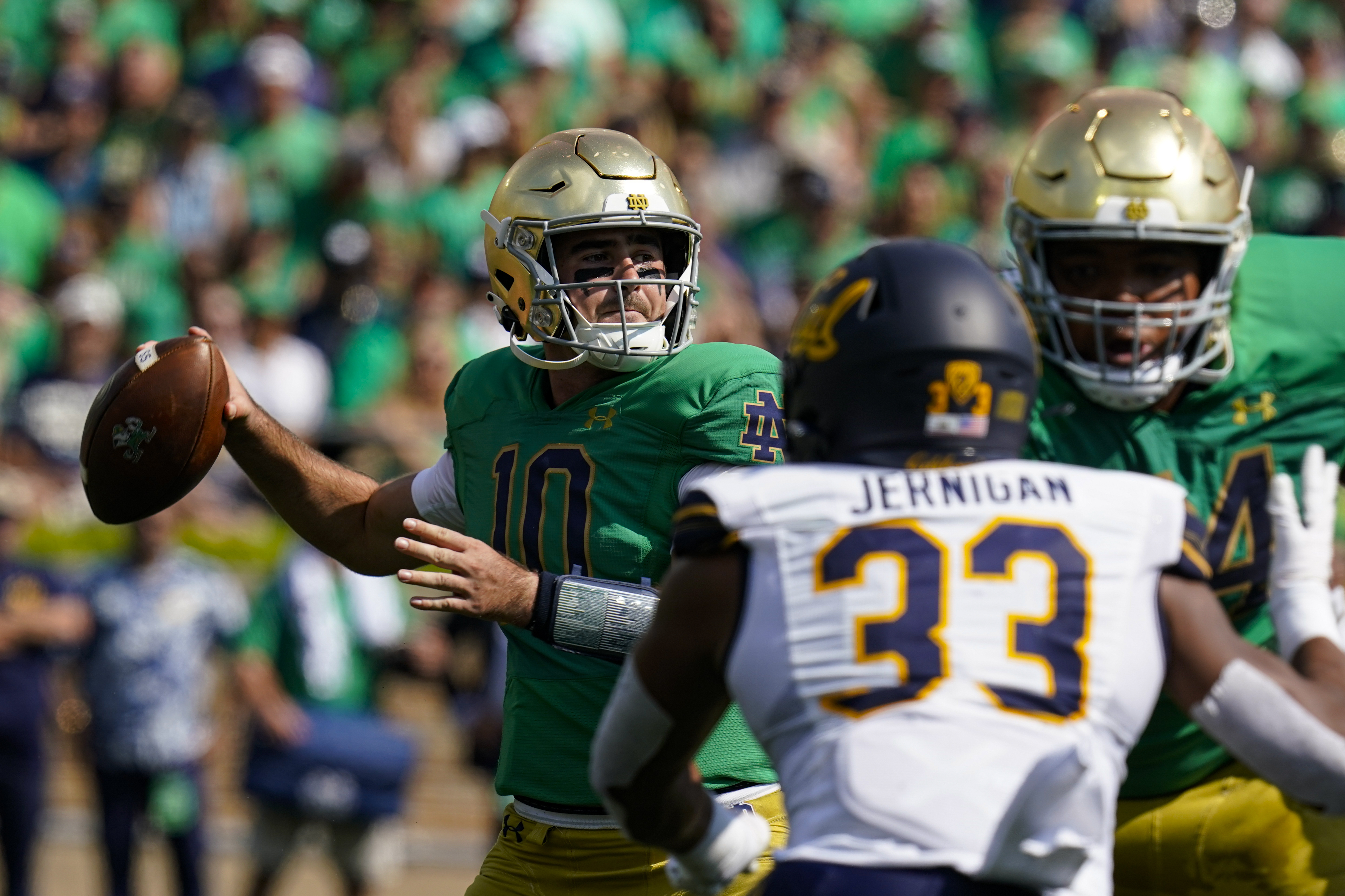 Notre Dame quarterback Drew Pyne (10) throws against California during the first half of an NCAA college football game in South Bend, Ind., Saturday, Sept. 17, 2022. (AP Photo/Michael Conroy)