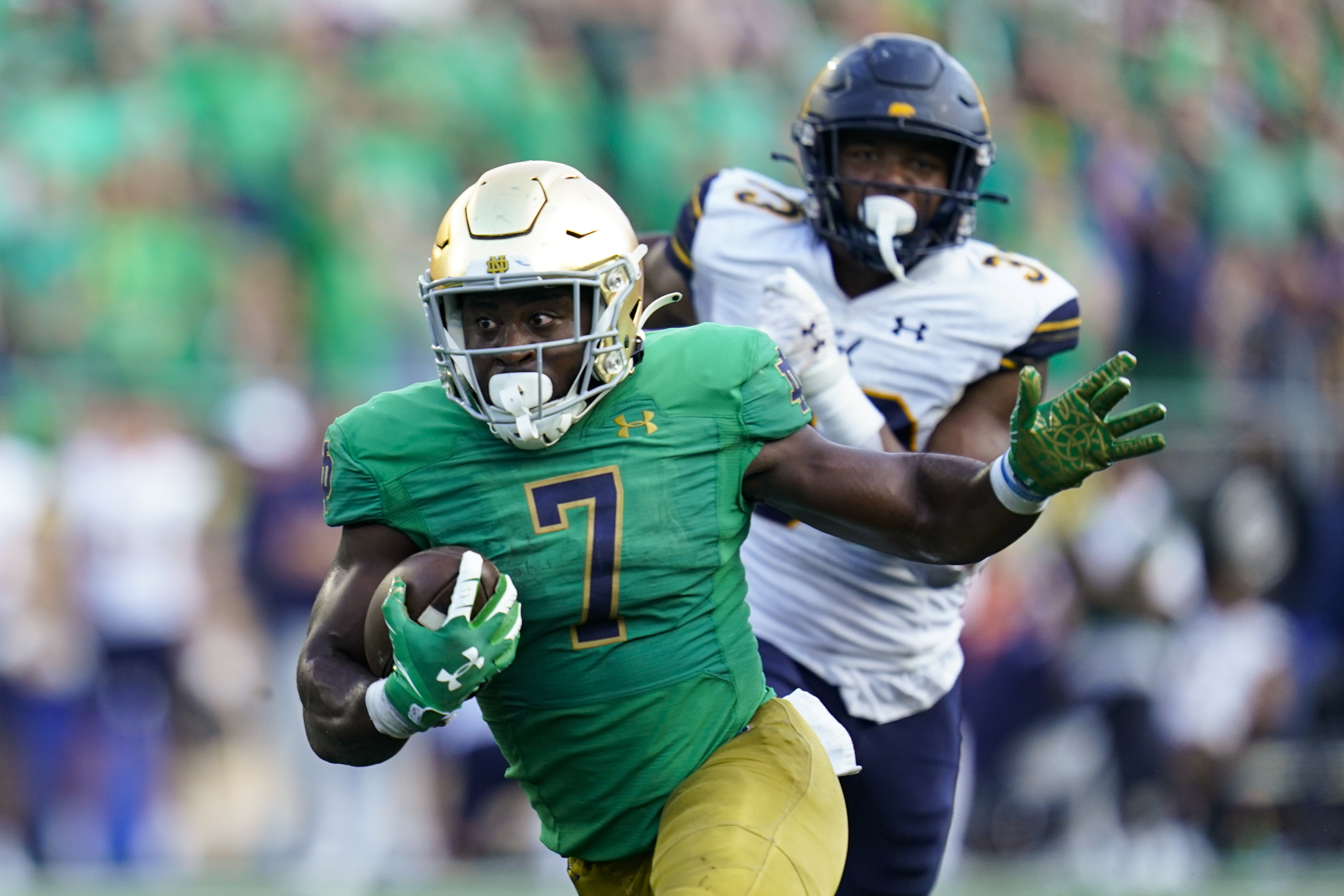 Notre Dame running back Audric Estime (7) picks up a first down in front of California linebacker Myles Jernigan (33) during the second half of an NCAA college football game in South Bend, Ind., Saturday, Sept. 17, 2022. Notre Dame defeated California 24-17.(AP Photo/Michael Conroy)