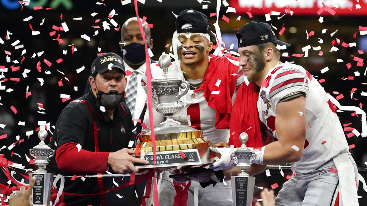 After the SEC champion Crimson Tide rolled past Notre Dame 31-14 in a Rose Bowl played in Texas, the No. 3 Buckeyes of the Big Ten beat Clemson 49-28 in the other semifinal at the Sugar Bowl on Friday night behind Justin Fields’ six touchdown passes.