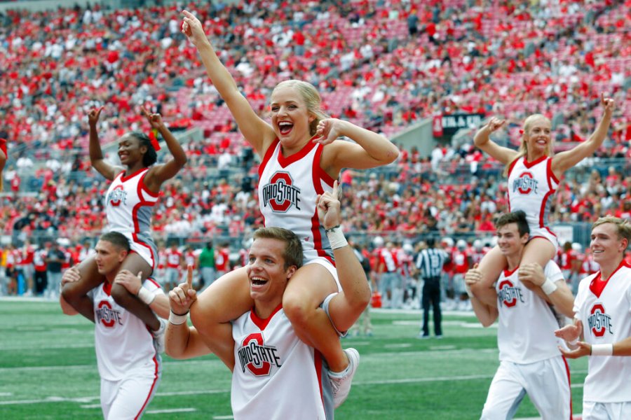 FILE - In this Aug. 31, 2019, file photo Ohio State cheerleaders yell to fans during an NCAA football game against Florida Atlantic in Columbus, Ohio. A New York-based sports network has turned to the federal courts in its trademark dispute with Ohio State University over use of the letter “O.” (AP Photo/Paul Vernon, File)