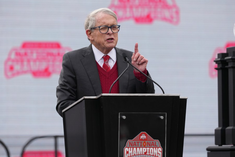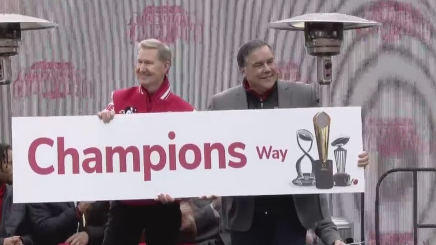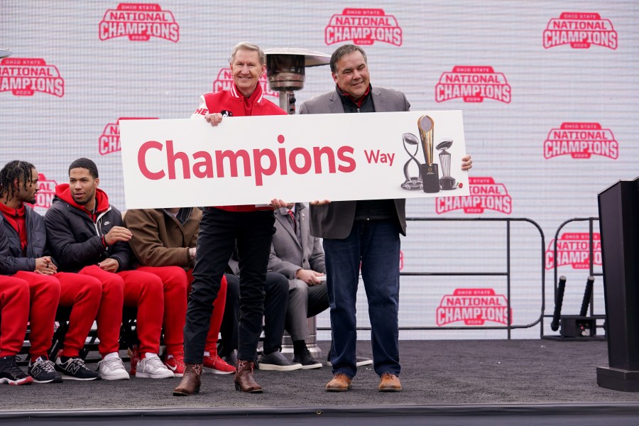 Among the speakers included Athletic Director Ross Bjork, Ohio Gov. Mike DeWine, and Columbus Mayor Andrew Ginther, who brought a new “Champions Way” street sign that will be outside the Horseshoe.