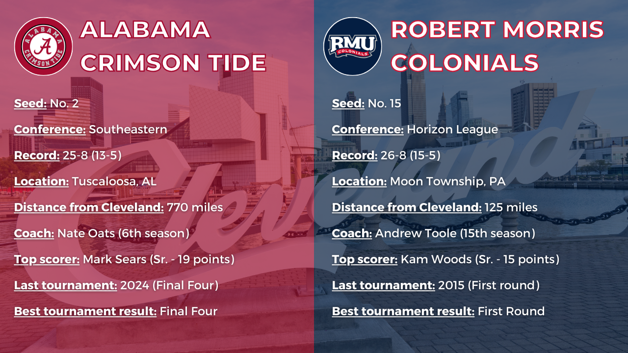 One of the first NCAA Tournament games to tip off on Friday will be in Cleveland as one of the tournament favorites take the floor. No. 2 seed Alabama will face No. 15 seed Robert Morris in one of the biggest mismatches in the first round.