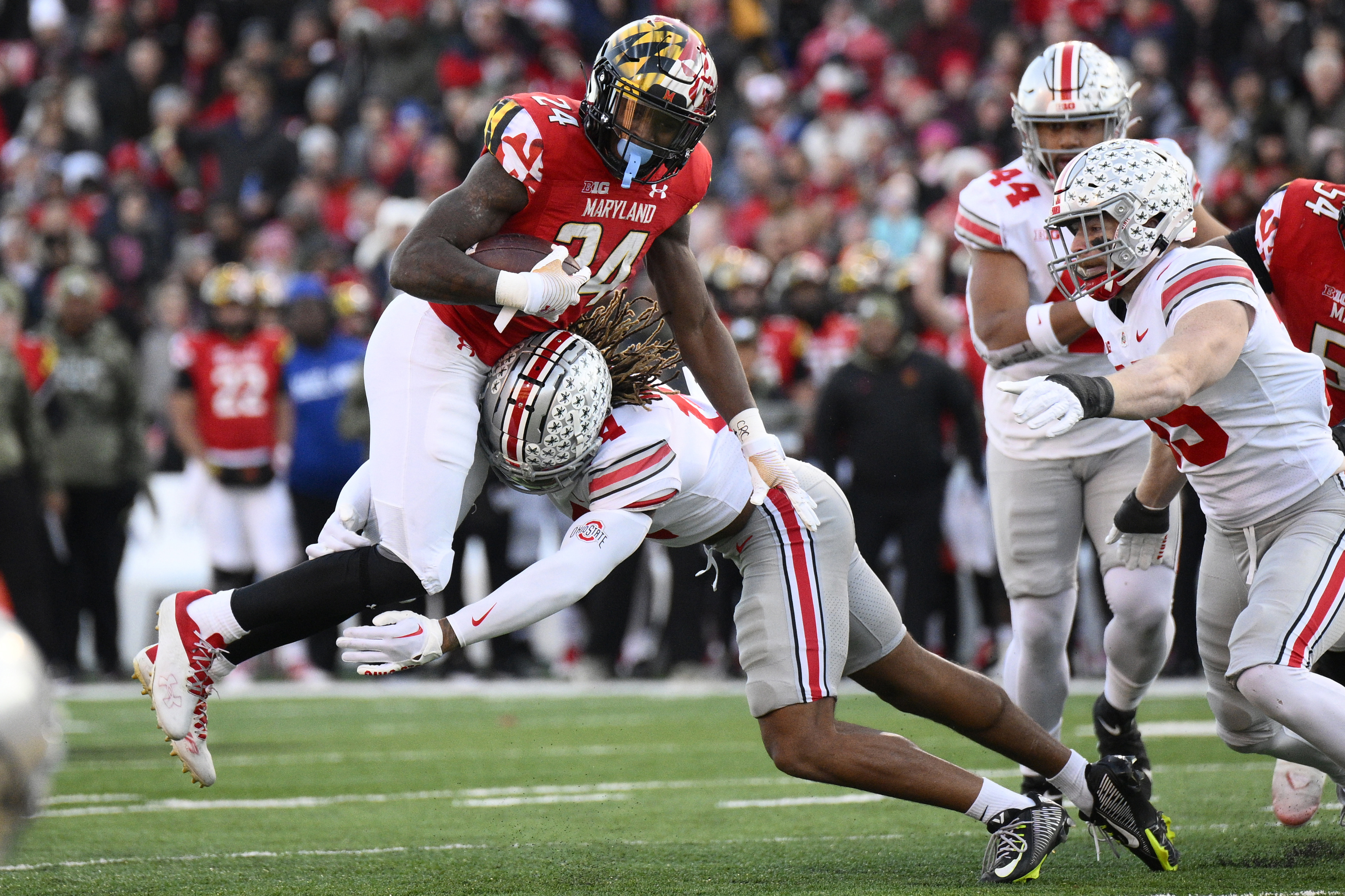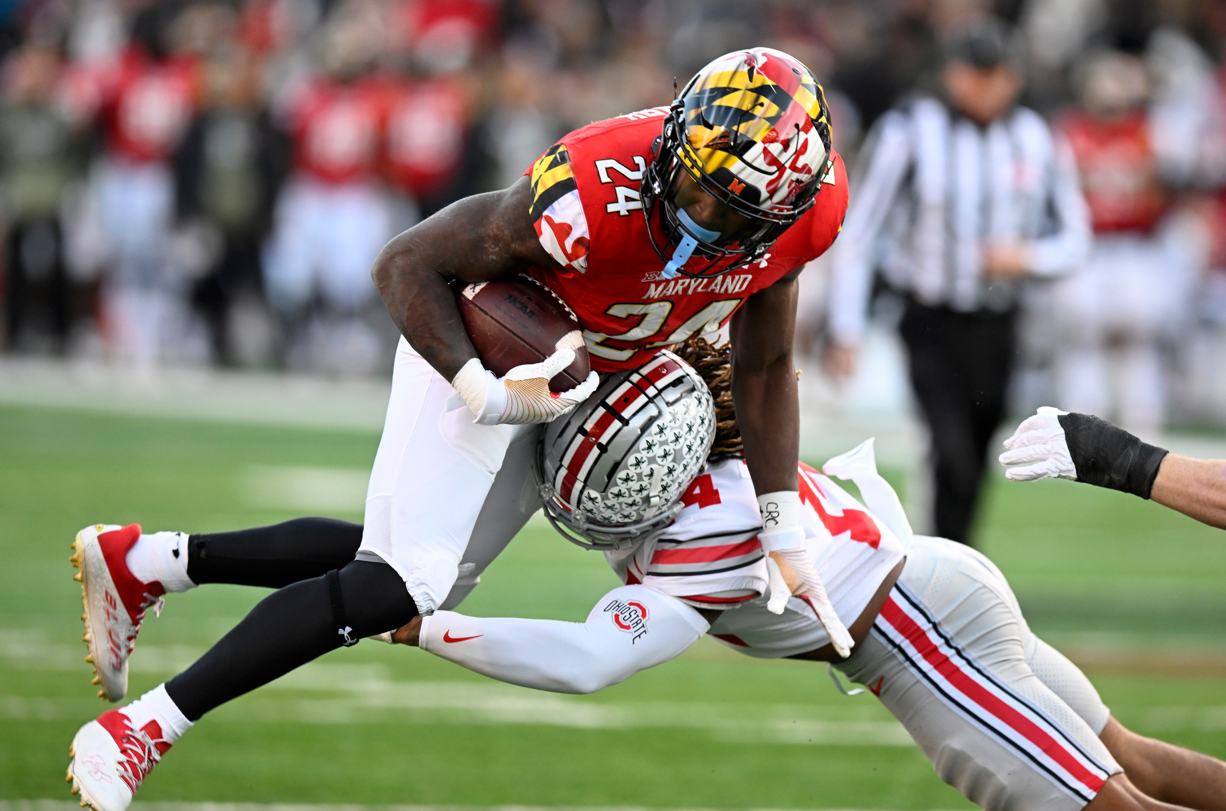 COLLEGE PARK, MARYLAND – NOVEMBER 19: Roman Hemby #24 of the Maryland Terrapins is tackled by Ronnie Hickman #14 of the Ohio State Buckeyes in the first quarter at SECU Stadium on November 19, 2022 in College Park, Maryland. (Photo by Greg Fiume/Getty Images)