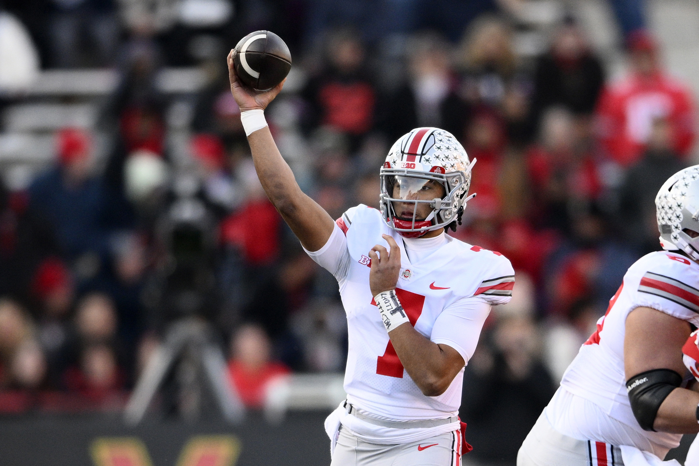 COLLEGE PARK, MARYLAND – NOVEMBER 19: C.J. Stroud #7 of the Ohio State Buckeyes throws a pass against the Maryland Terrapins in the second quarter at SECU Stadium on November 19, 2022 in College Park, Maryland. (Photo by Greg Fiume/Getty Images)