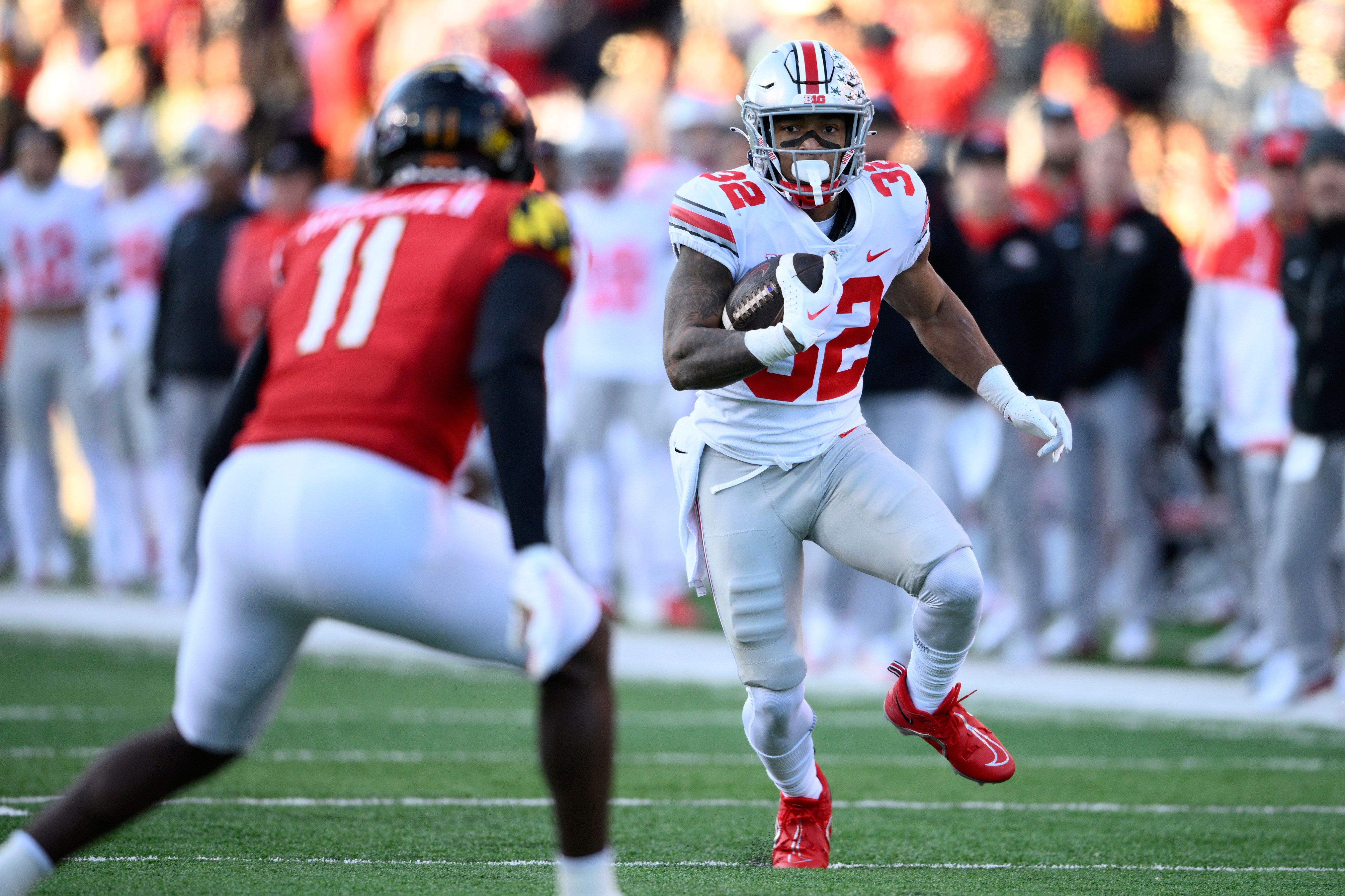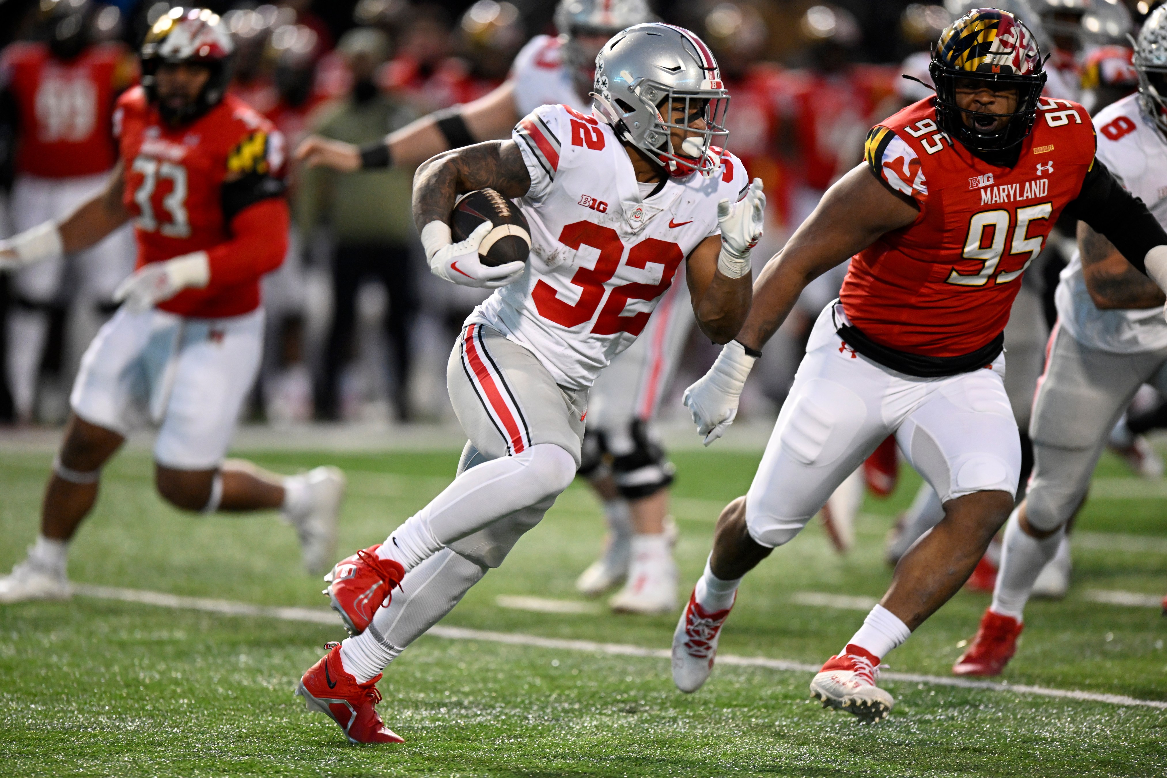 COLLEGE PARK, MARYLAND – NOVEMBER 19: TreVeyon Henderson #32 of the Ohio State Buckeyes rushes the ball in the second quarter against the Maryland Terrapins at SECU Stadium on November 19, 2022 in College Park, Maryland. (Photo by Greg Fiume/Getty Images)