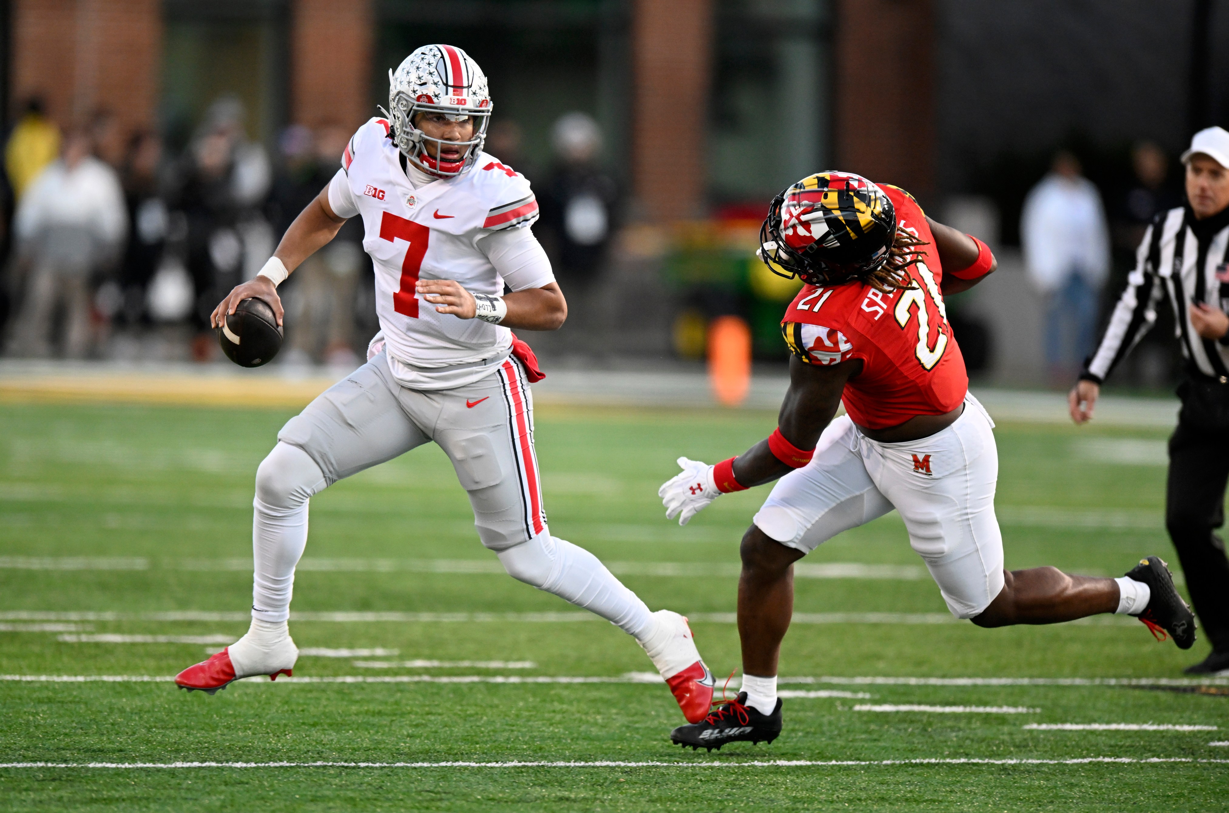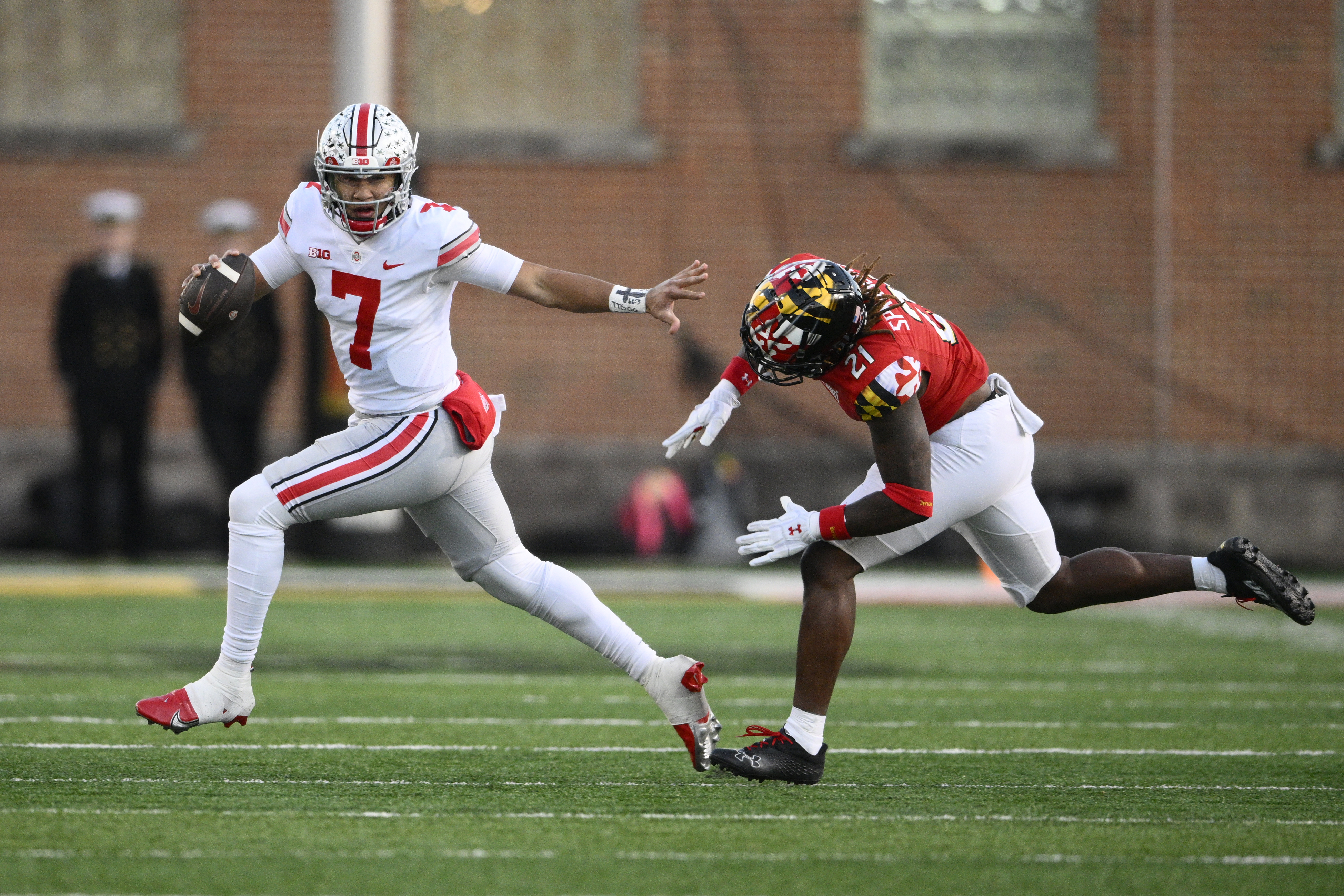 COLLEGE PARK, MARYLAND – NOVEMBER 19: C.J. Stroud #7 of the Ohio State Buckeyes rolls out of the pocket against Gereme Spraggins #21 of the Maryland Terrapins in the second quarter at SECU Stadium on November 19, 2022 in College Park, Maryland. (Photo by Greg Fiume/Getty Images)