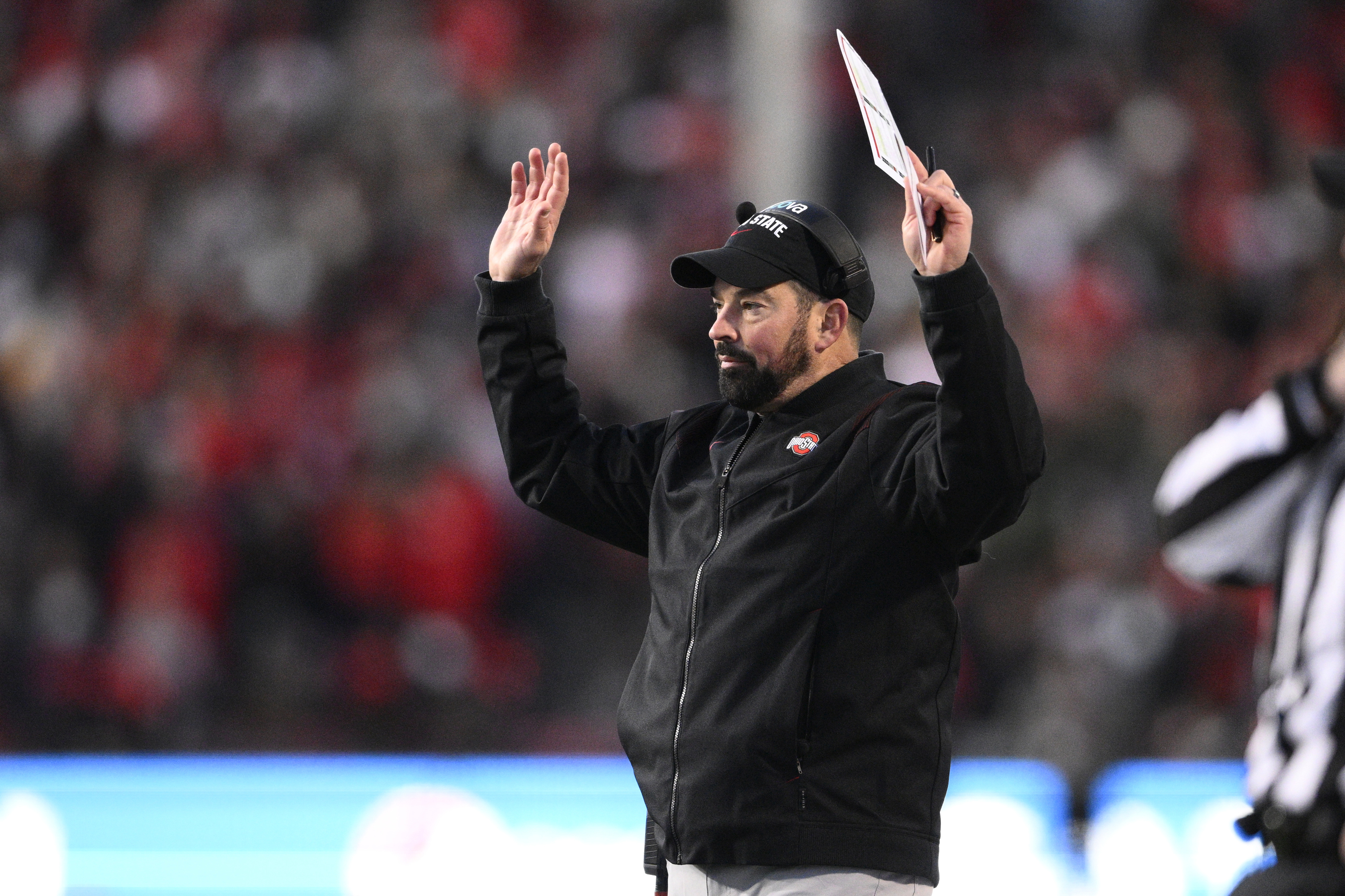 Ohio State head coach Ryan Day gestures during the first half of an NCAA college football game against Maryland, Saturday, Nov. 19, 2022, in College Park, Md. (AP Photo/Nick Wass)