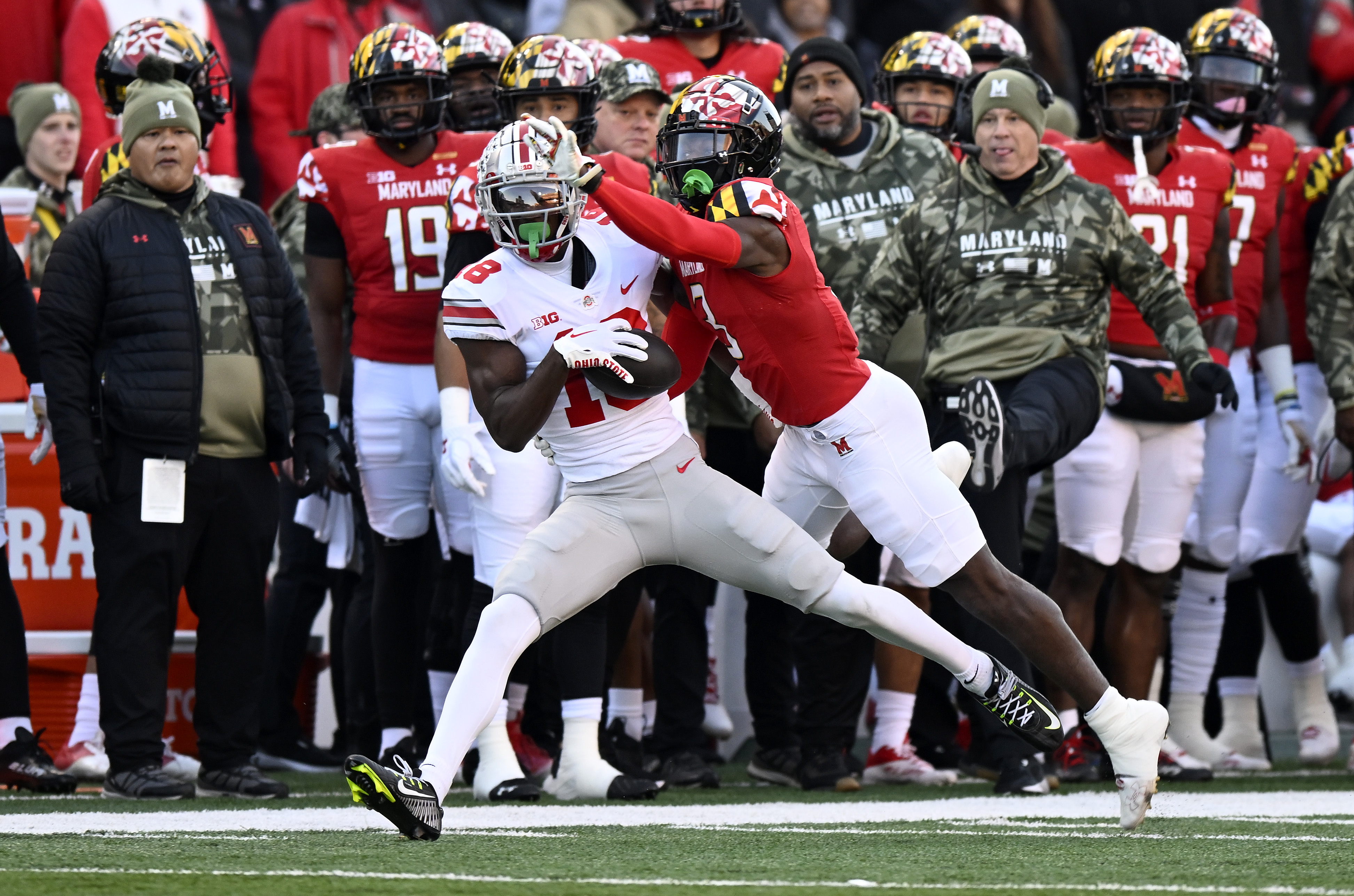 COLLEGE PARK, MARYLAND – NOVEMBER 19: Marvin Harrison Jr. #18 of the Ohio State Buckeyes makes a catch in the first quarter against Deonte Banks #3 of the Maryland Terrapins at SECU Stadium on November 19, 2022 in College Park, Maryland. (Photo by Greg Fiume/Getty Images)