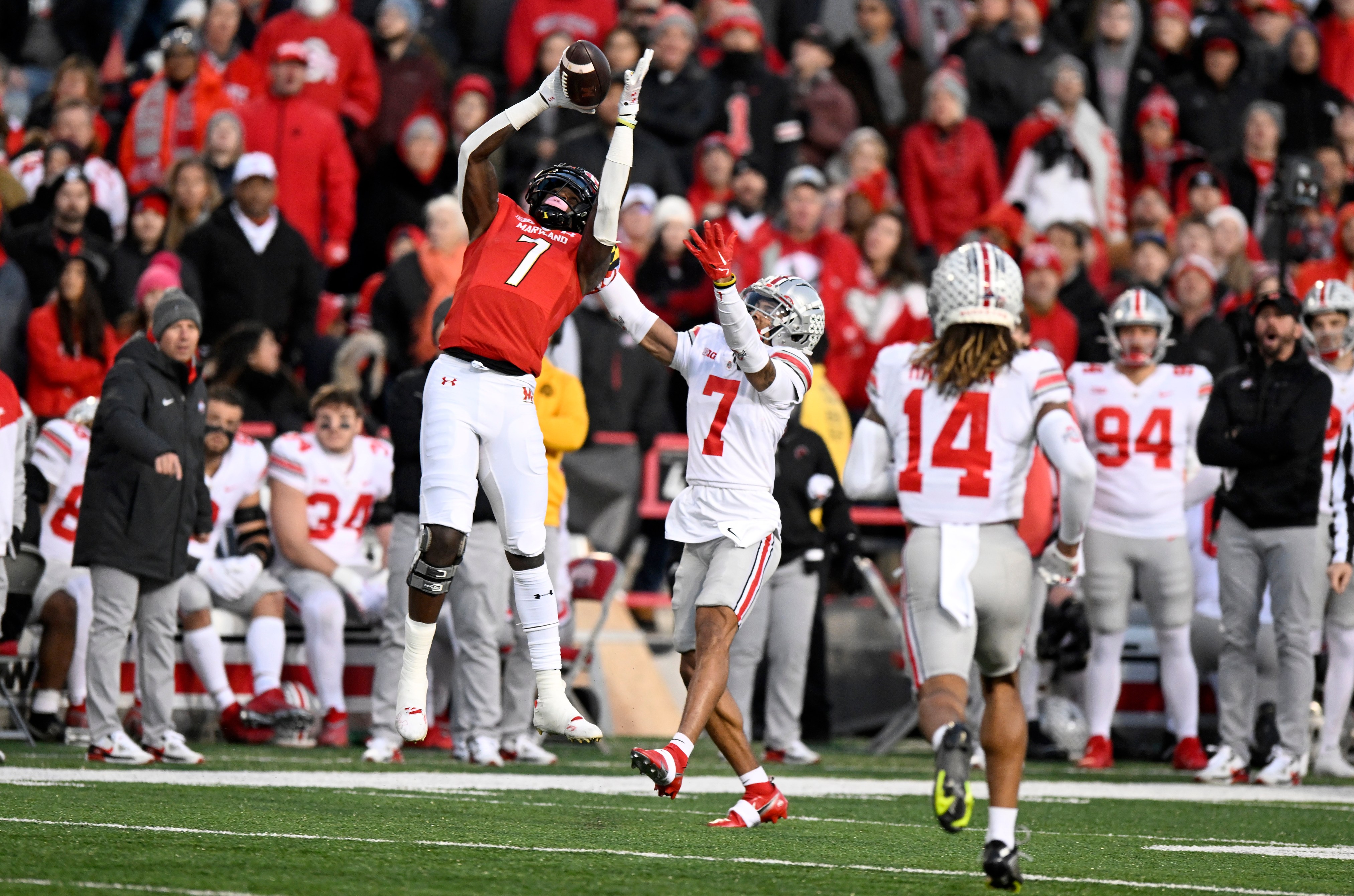 COLLEGE PARK, MARYLAND – NOVEMBER 19: Dontay Demus Jr. #7 of the Maryland Terrapins makes a catch in the second quarter against Jordan Hancock #7 of the Ohio State Buckeyes at SECU Stadium on November 19, 2022 in College Park, Maryland. (Photo by Greg Fiume/Getty Images)