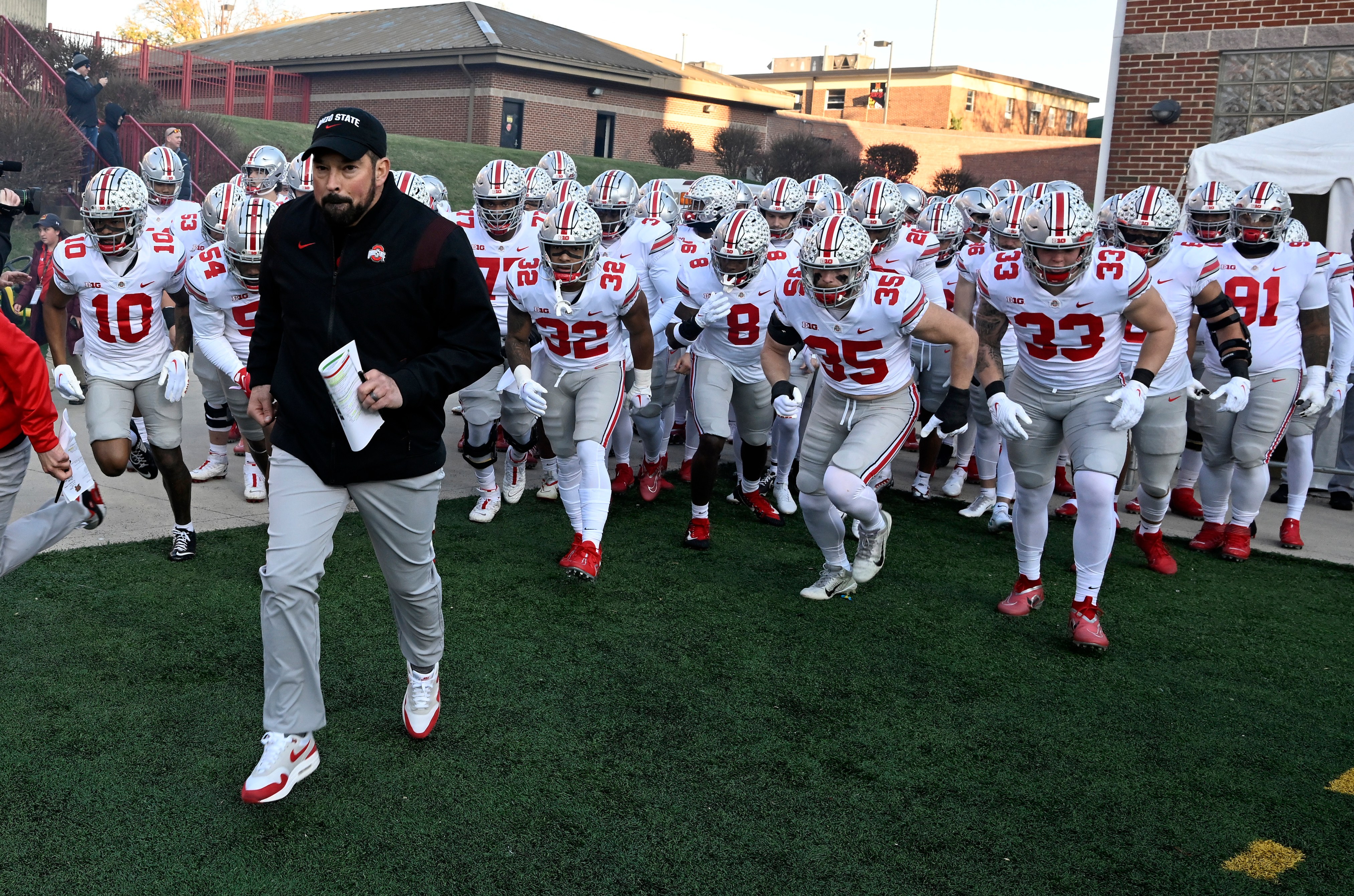 COLLEGE PARK, MARYLAND – NOVEMBER 19: Head coach Ryan Day of the Ohio State Buckeyes leads his team onto the field before the game against the Maryland Terrapins at SECU Stadium on November 19, 2022 in College Park, Maryland. (Photo by Greg Fiume/Getty Images)