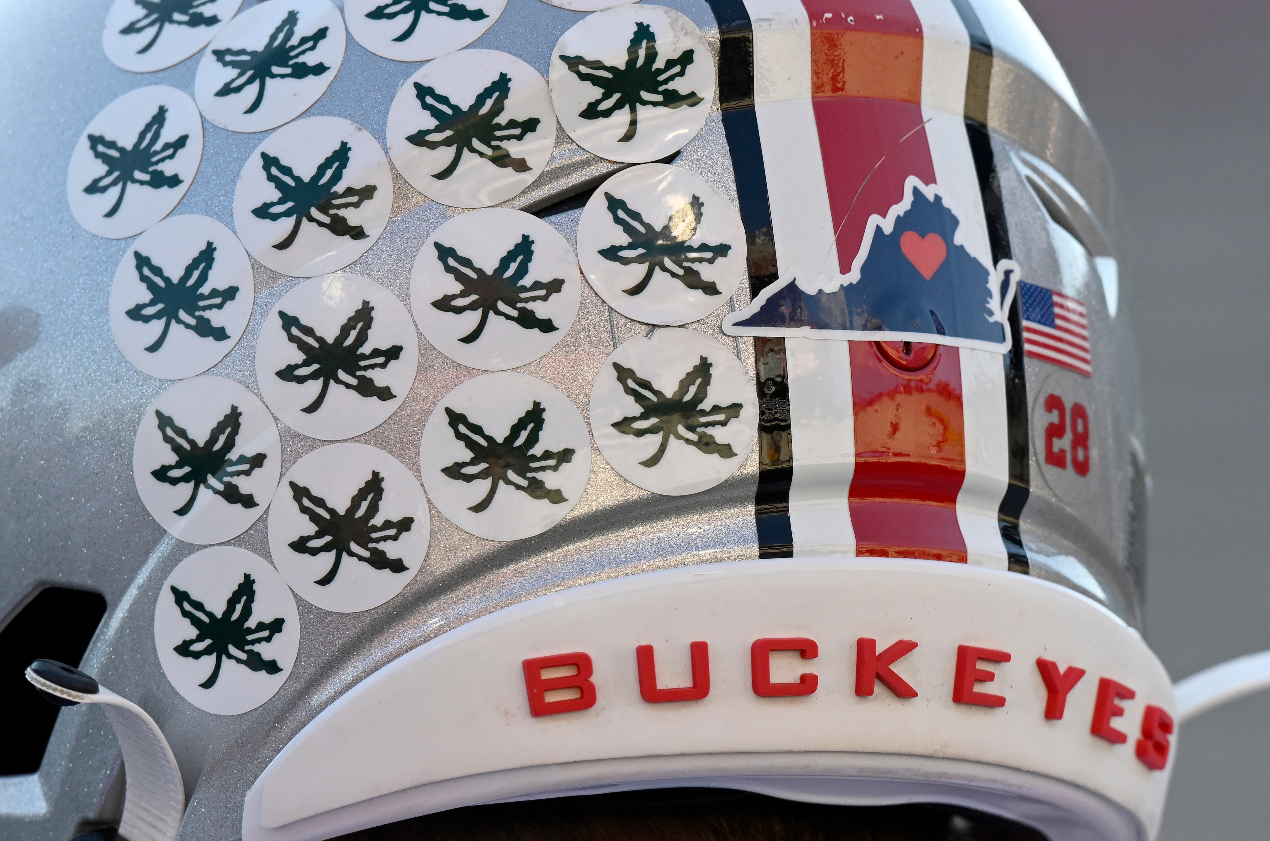 COLLEGE PARK, MARYLAND – NOVEMBER 19: The Ohio State Buckeyes wear a Virginia sticker on their helmet to honor the shooting victims from the University of Virginia during the game against the Maryland Terrapins at SECU Stadium on November 19, 2022 in College Park, Maryland. (Photo by Greg Fiume/Getty Images)