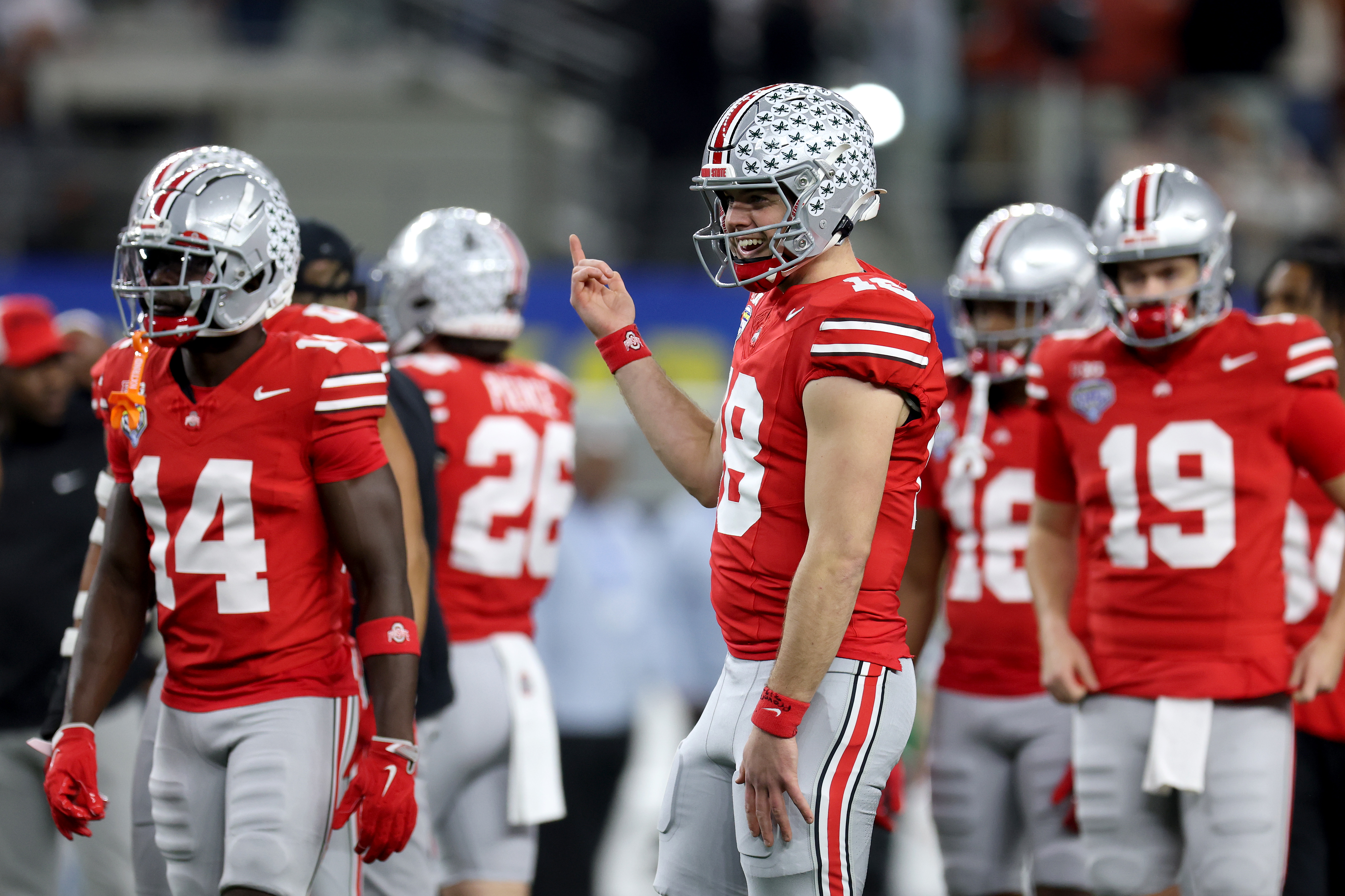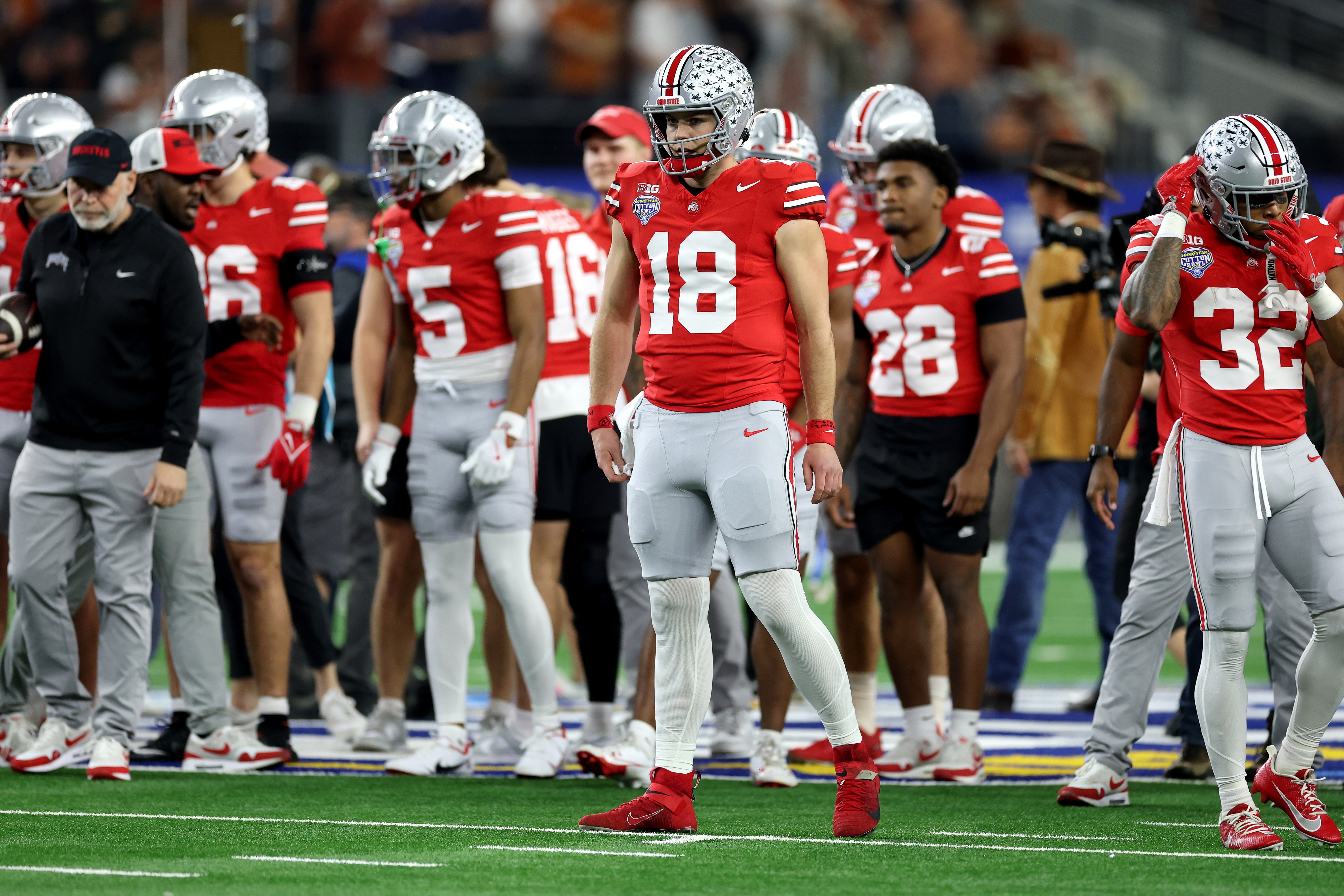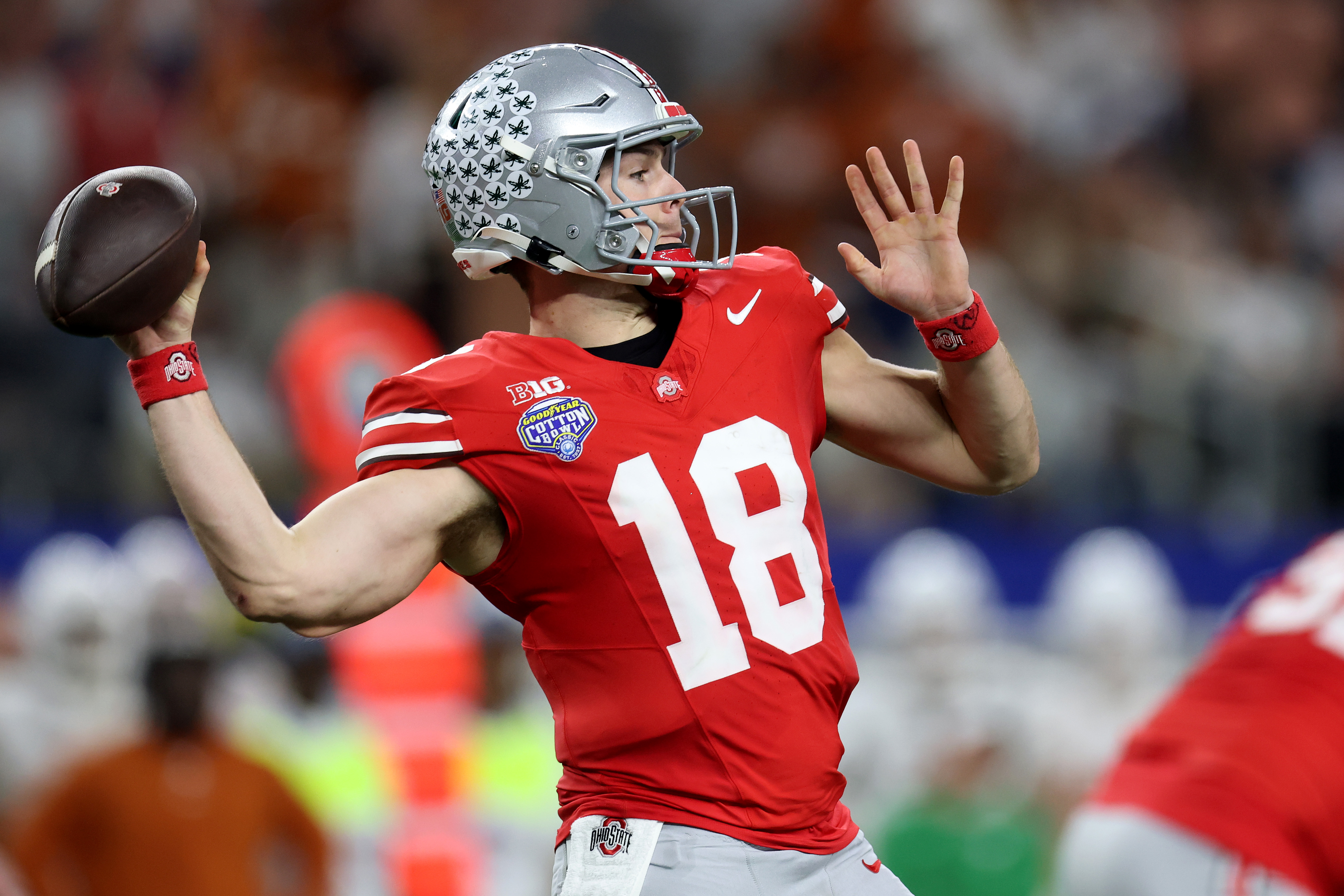 ARLINGTON, TEXAS – JANUARY 10: Will Howard #18 of the Ohio State Buckeyes warms up before the Goodyear Cotton Bowl against the Texas Longhorns at AT&T Stadium on January 10, 2025 in Arlington, Texas. (Photo by Jamie Squire/Getty Images)