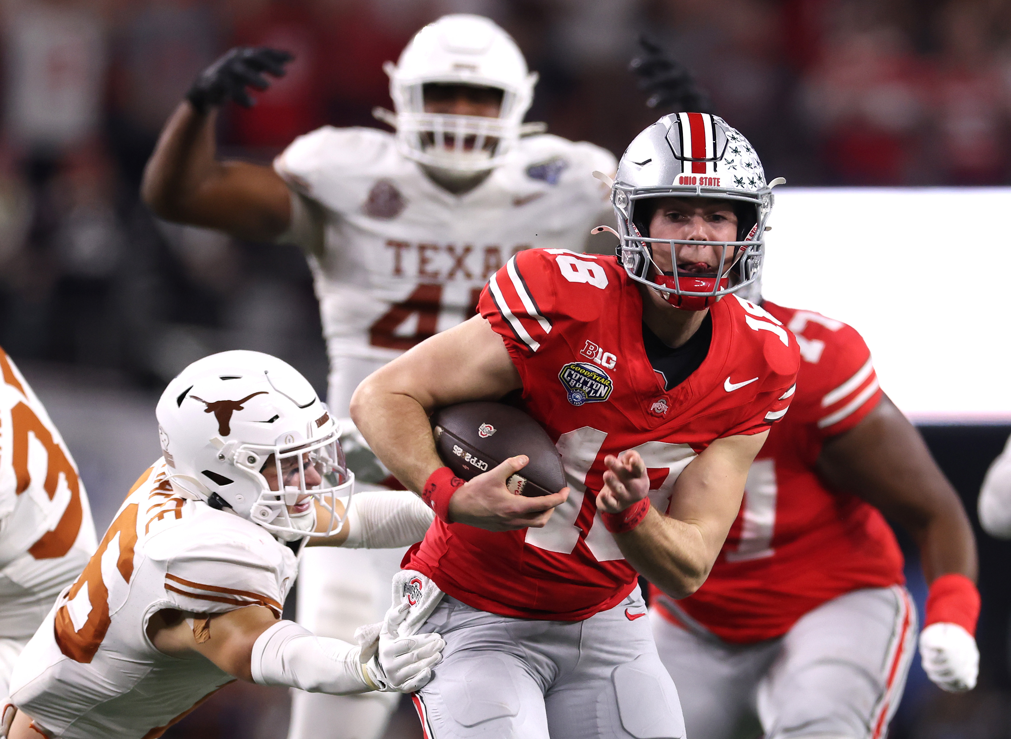 ARLINGTON, TEXAS – JANUARY 10: Will Howard #18 of the Ohio State Buckeyes runs with the ball while being chased by Michael Taaffe #16 of the Texas Longhorns in the fourth quarter during the Goodyear Cotton Bowl at AT&T Stadium on January 10, 2025 in Arlington, Texas. (Photo by Sam Hodde/Getty Images)