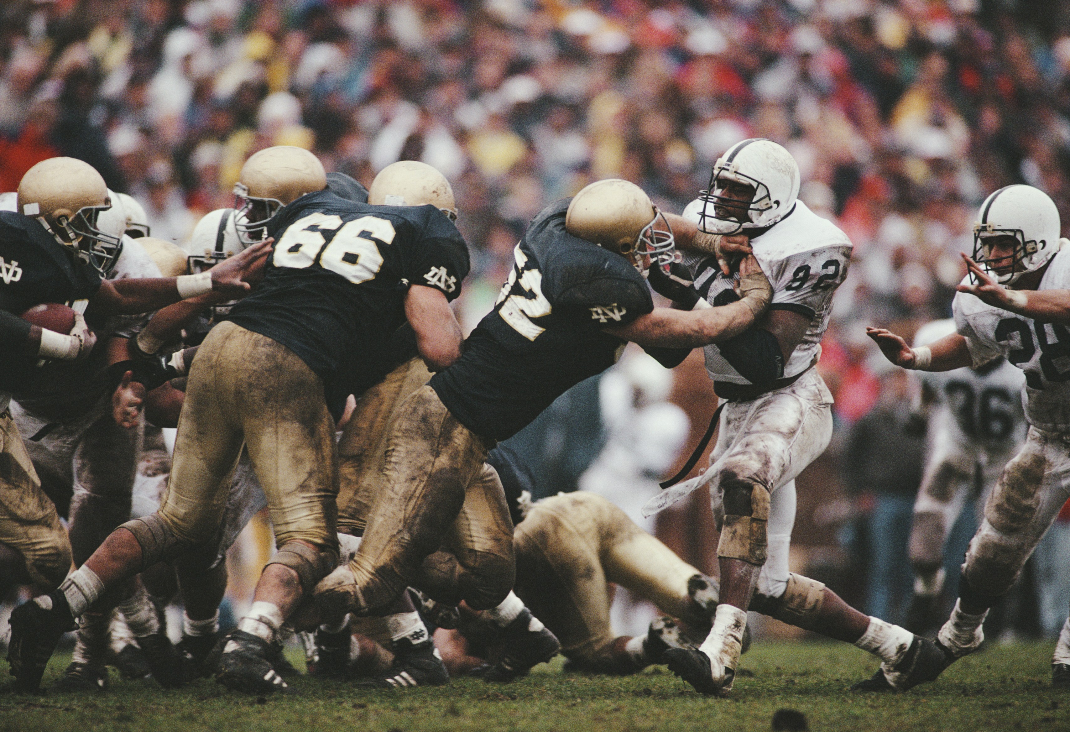 Bryan Flannery #92 Defensive Lineman for the Penn State Nittany Lions and Tim Ryan #52 Offensive Lineman for the Notre Dame Fighting Irish during their NCAA Independent college football game on 19 November 1988 at the Notre Dame Stadium in Notre Dame, Indiana, United States. Notre Dame won the game 21 – 3. (Photo by Jonathan Daniel/Allsport/Getty Images)