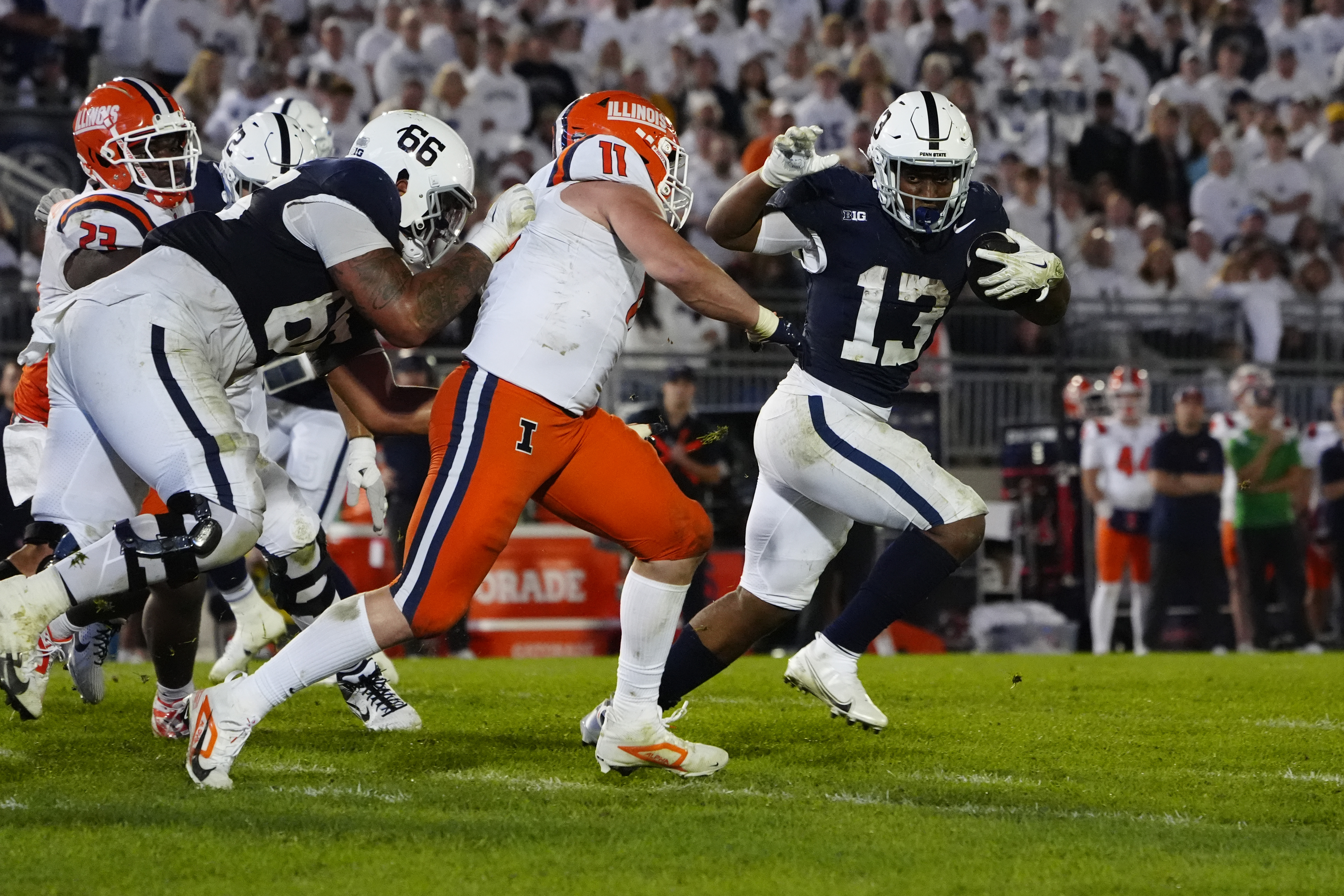 UNIVERSITY PARK, PA – SEPTEMBER 28: Penn State Nittany Lions Running Back Kaytron Allen (13) runs with the ball against Illinois Fighting Illini Defensive Lineman Alex Bray (11) during the second half of the College Football game between the Illinois Fighting Illini and the Penn State Nittany Lions on September 28, 2024, at Beaver Stadium in University Park, PA. (Photo by Gregory Fisher/Icon Sportswire via Getty Images)