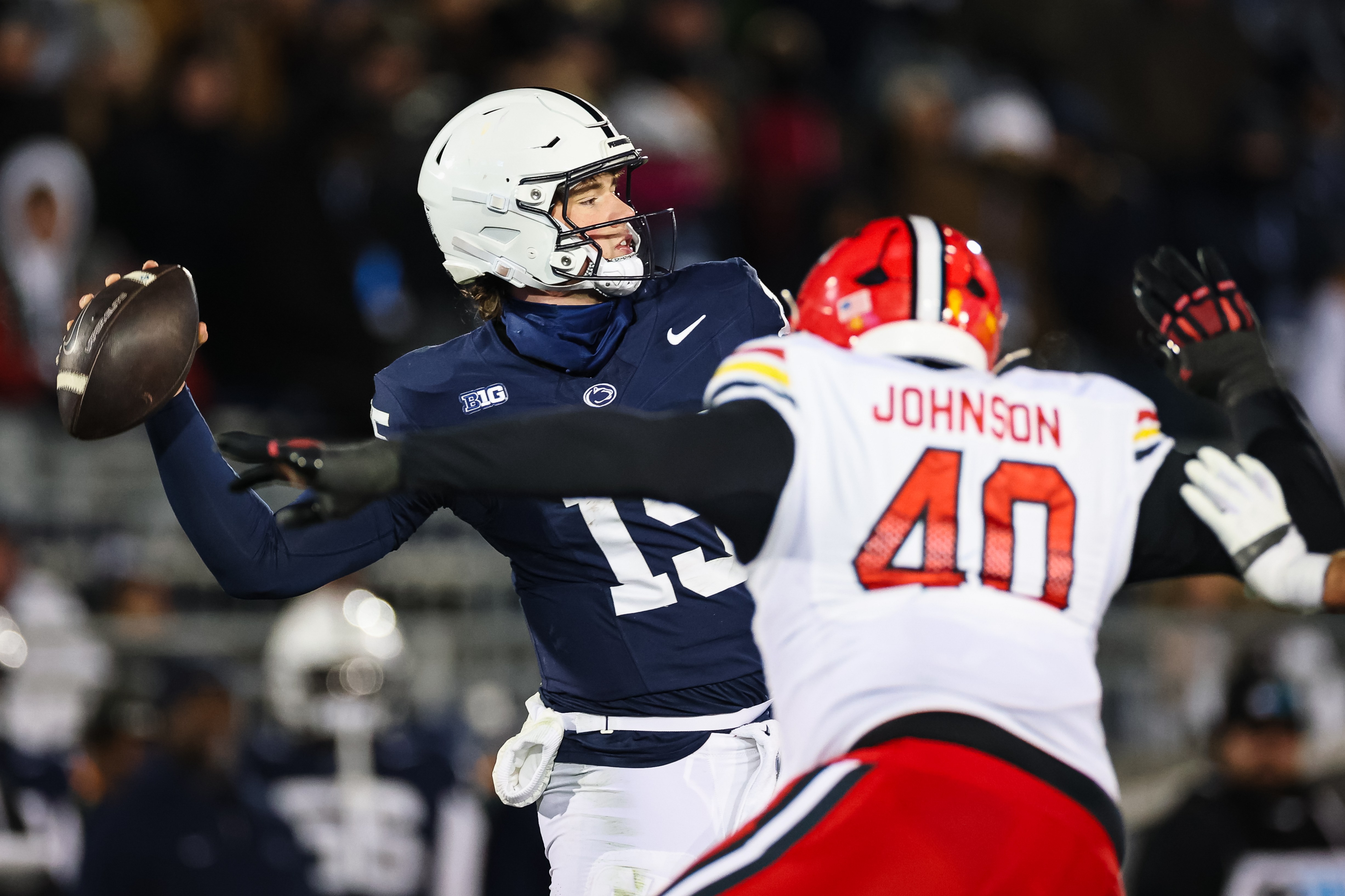 STATE COLLEGE, PA – NOVEMBER 30: Drew Allar #15 of the Penn State Nittany Lions looks to pass as Taizse Johnson #40 of the Maryland Terrapins applies pressure during the first half at Beaver Stadium on November 30, 2024 in State College, Pennsylvania. (Photo by Scott Taetsch/Getty Images)