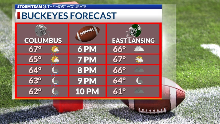 For those traveling to East Lansing, Michigan, on Saturday for the Buckeyes’ Big Ten opener, expect drier conditions up there temperatures will be in the mid 60s with mostly cloudy skies. They will see a sprinkler too, but we’re more likely to see scattered rain showers in central Ohio thanks to the remnants of hurricane Helene.