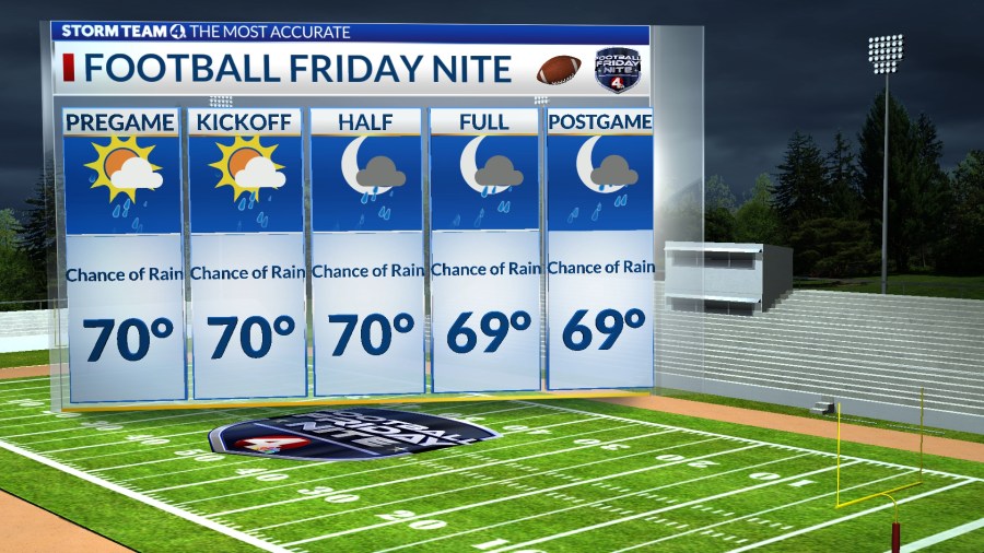 Temperatures throughout Friday night football games are expected to stay in the low 70s and finish in the upper 60s with scattered showers on and off throughout the evening