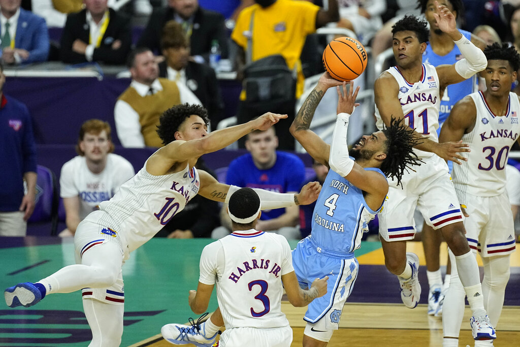 North Carolina missed its final four shots, including Caleb Love’s desperation 3 at the buzzer. His heave came up short after officials ruled that Kansas guard DaJuan Harris Jr., stepped out on an inbounds pass with 4.3 seconds left.