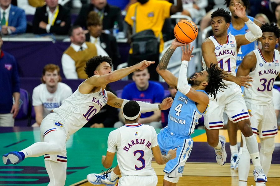North Carolina missed its final four shots, including Caleb Love’s desperation 3 at the buzzer. His heave came up short after officials ruled that Kansas guard DaJuan Harris Jr., stepped out on an inbounds pass with 4.3 seconds left.