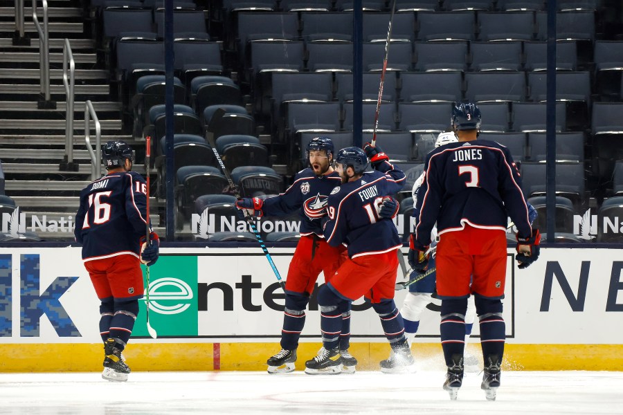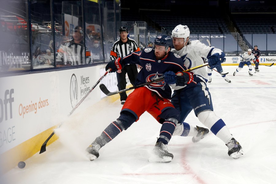 COLUMBUS, Ohio (WCMH) — The Columbus Blue Jackets dropped their home opener 3-2 in OT to defending Stanley Cup champion Tampa Bay in front of a mostly empty Nationwide Arena on Thursday night.