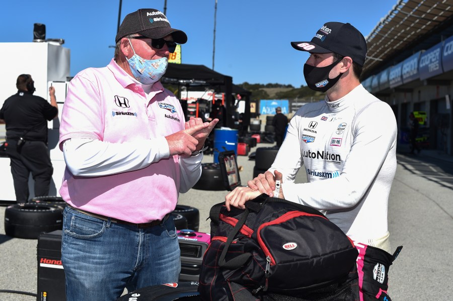 Meyer Shank Racing co-owner Jim Meyer, left, talks with driver Jack Harvey, right, during an IndyCar test session at Laguna Seca Raceway in Monterey, Calif., on March 1, 2021. (Photo by Chris Owens/IndyCar)
