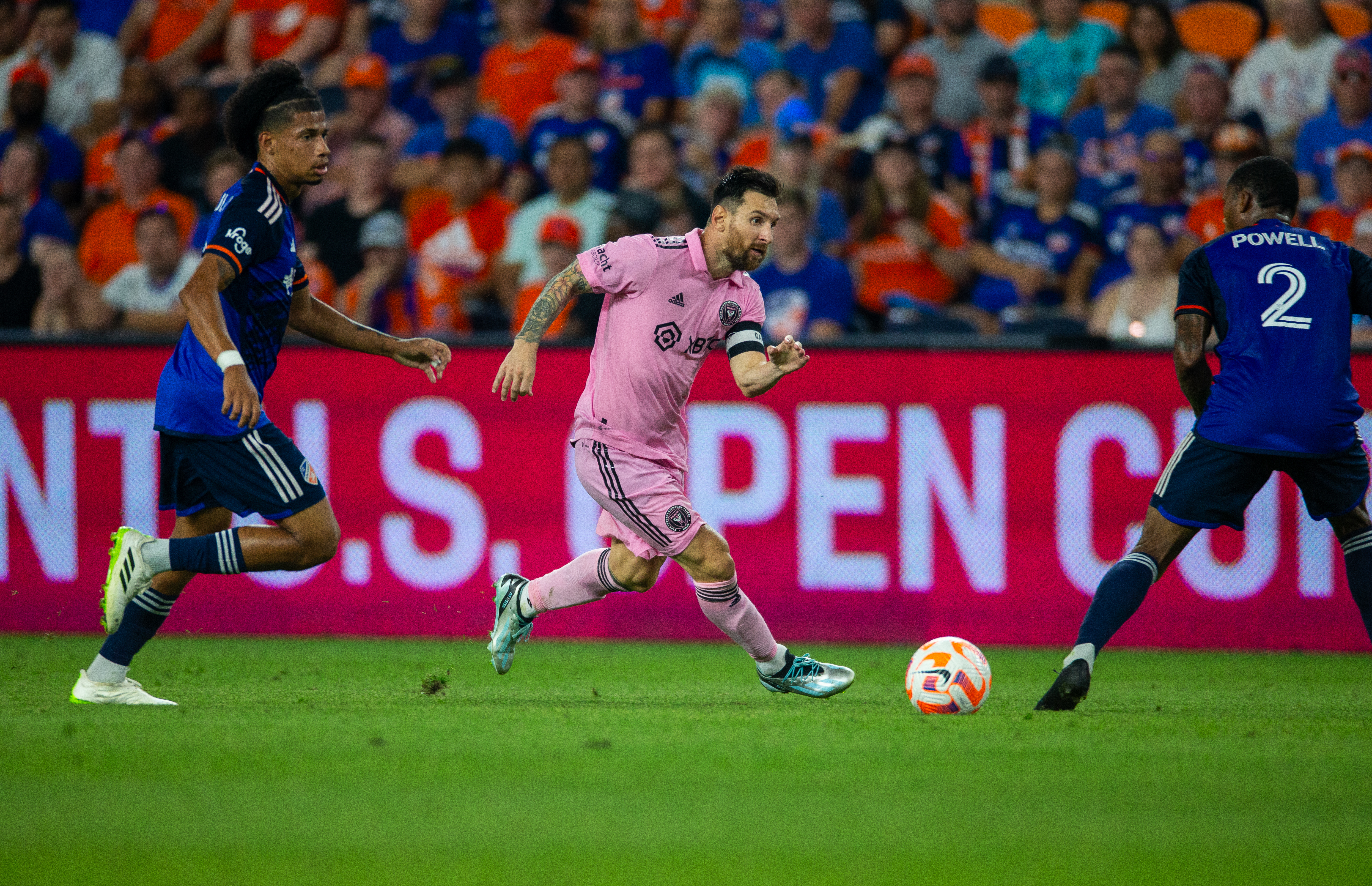 CINCINNATI, OH – AUGUST 23: Lionel Messi #10 of Inter Miami CF evades two defenders from Cincinnati FC during U.S.Open Cup Semifinal game between Inter Miami CF and FC Cincinnati at TQL Stadium on August 23, 2023 in Cincinnati, Ohio. (Photo by Michael Miller/ISI Photos/Getty Images)