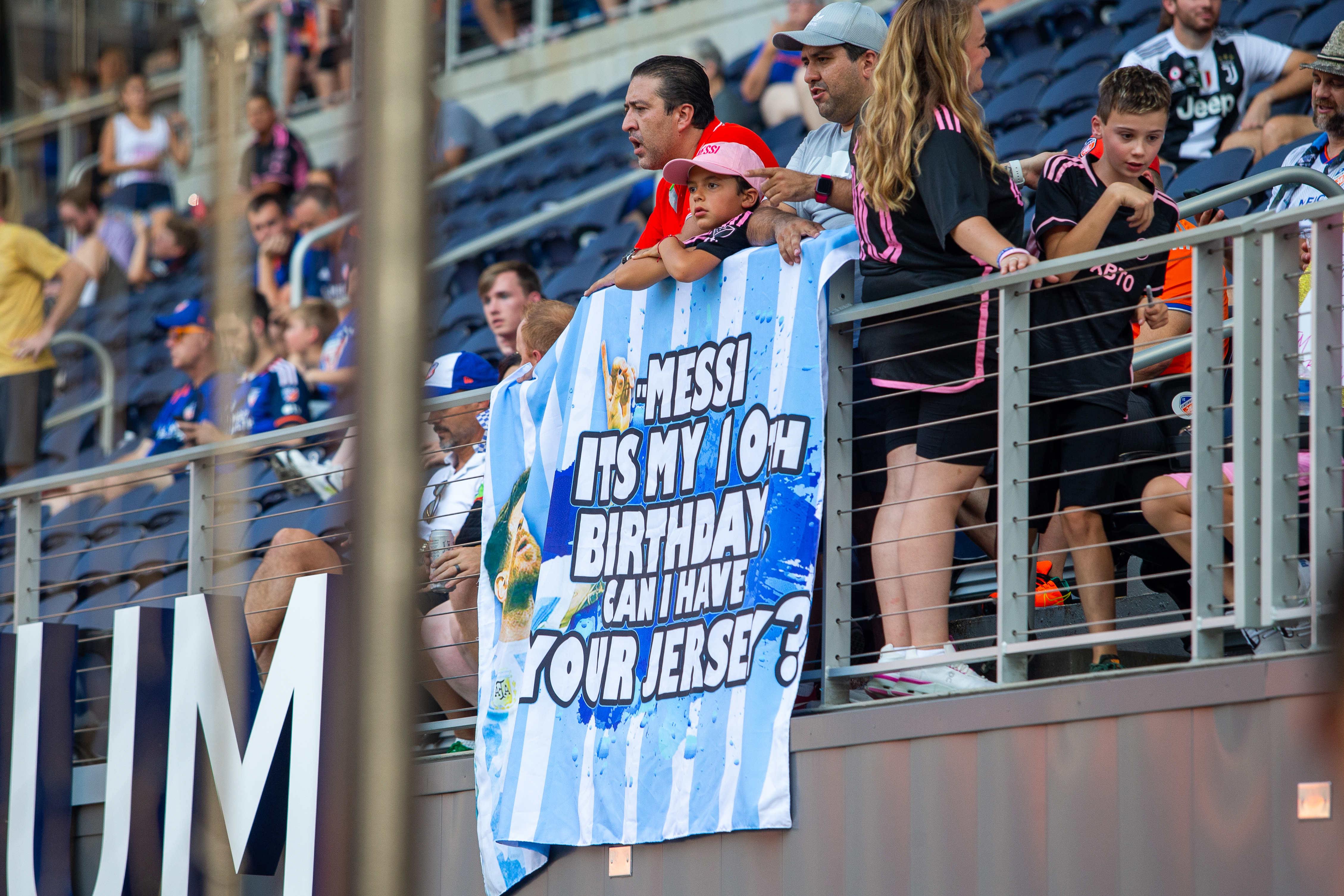 CINCINNATI, OH – AUGUST 23: A young fans birthday wish banner is displayed before a U.S.Open Cup Semifinal game between Inter Miami CF and FC Cincinnati at TQL Stadium on August 23, 2023 in Cincinnati, Ohio. (Photo by Michael Miller/ISI Photos/Getty Images)