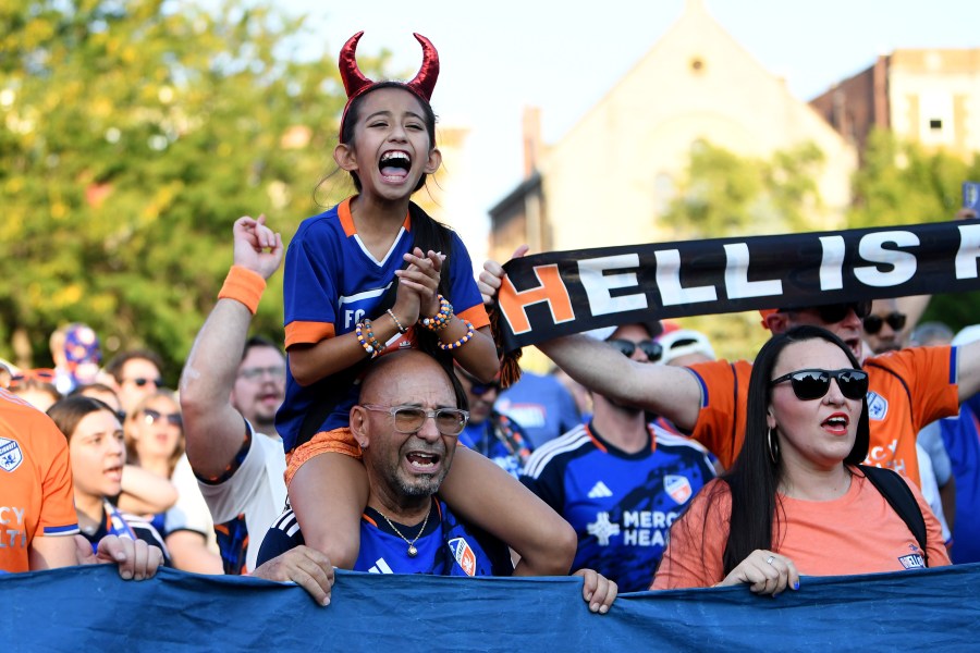 CINCINNATI, OHIO – SEPTEMBER 14: FC Cincinnati fans cheer during a pregame march to the match before a game against the Columbus Crew at TQL Stadium on September 14, 2024 in Cincinnati, Ohio. (Photo by Emilee Chinn/Getty Images)