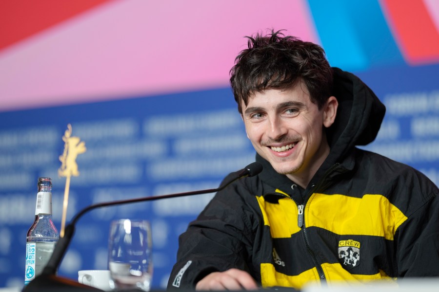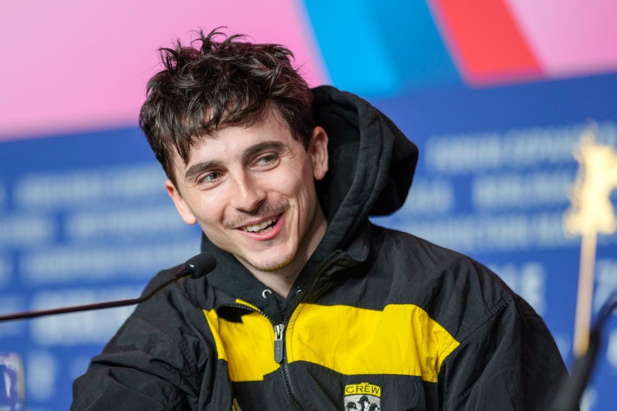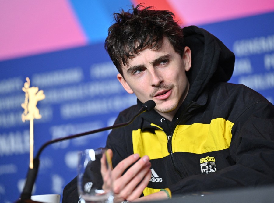 Chalamet wore a yellow-and-black striped hooded jacket that contained the original 1990s logo of the Columbus Crew, with its three hard hat-wearing men. Nominated for a best actor Oscar, Chalamet posed for photos and answered questions while wearing Crew gear.