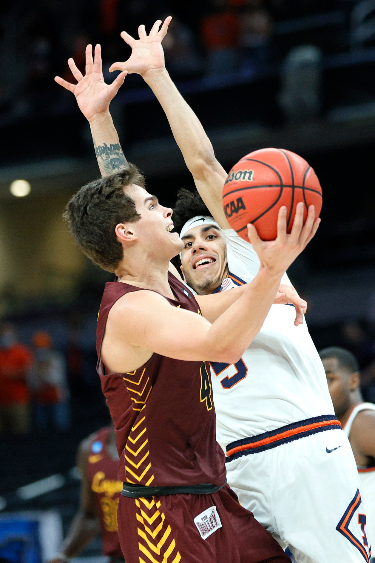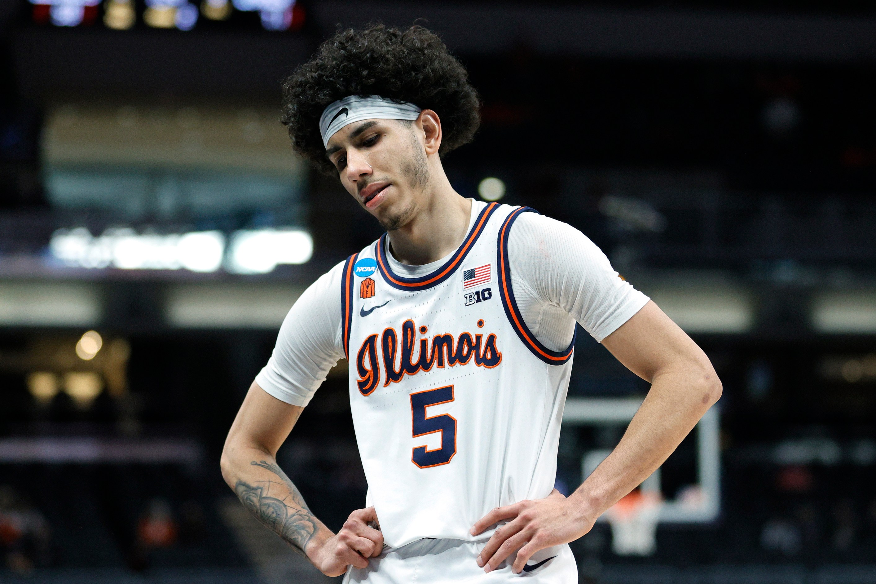 INDIANAPOLIS, INDIANA – MARCH 21: Andre Curbelo #5 of the Illinois Fighting Illini reacts against the Loyola Chicago Ramblers during the second half in the second round game of the 2021 NCAA Men’s Basketball Tournament at Bankers Life Fieldhouse on March 21, 2021 in Indianapolis, Indiana. (Photo by Sarah Stier/Getty Images)