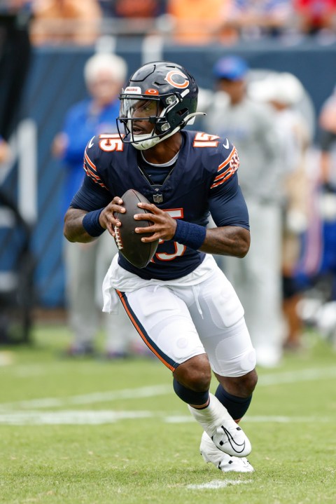 Chicago Bears quarterback PJ Walker (15) looks to pass the ball against the Buffalo Bills during the second half of an NFL preseason football game, Saturday, Aug. 26, 2023, in Chicago. (AP Photo/Kamil Krzaczynski)