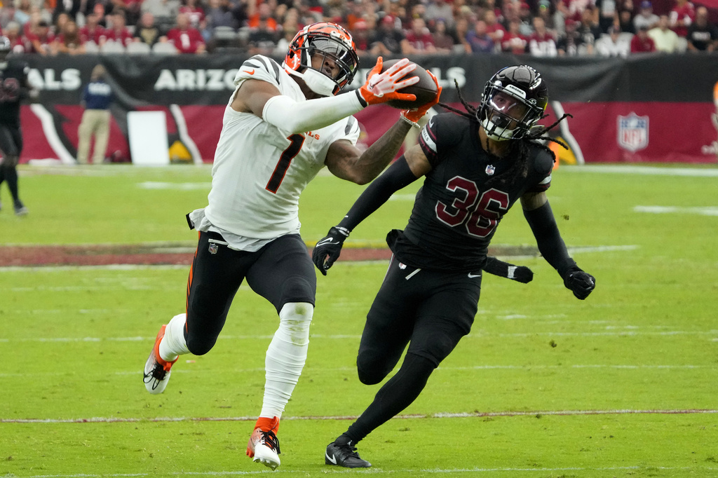 Cincinnati Bengals wide receiver Ja’Marr Chase (1) pulls in a touchdown pass during the second half of an NFL football game against the Arizona Cardinals, Sunday, Oct. 8, 2023, in Glendale, Ariz. (AP Photo/Rick Scuteri)