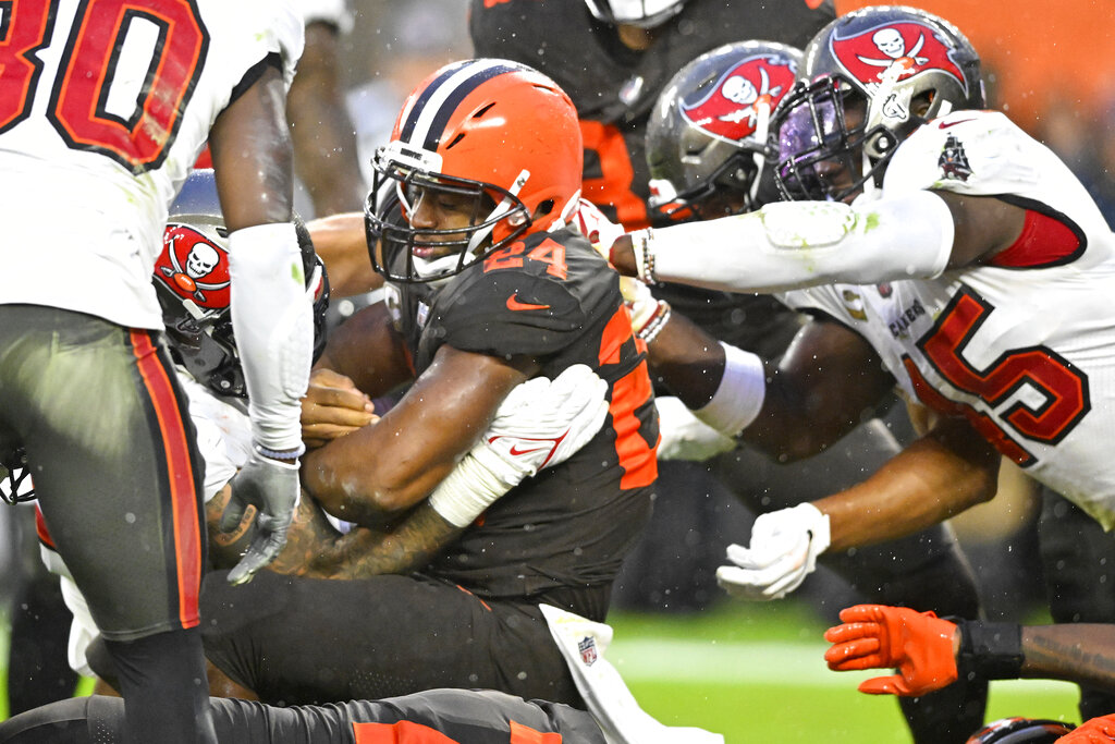 Chubb’s short TD was set up when Brissett connected on a 45-yard pass to wide receiver Amari Cooper, who found himself wide open when Bucs cornerback Carlton Davis III slipped and fell near midfield.