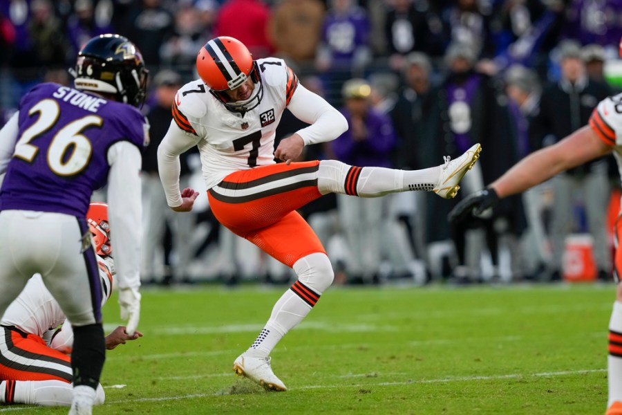 Cleveland Browns place-kicker Dustin Hopkins kicks the game winning field goal against the Baltimore Ravens during the second half on an NFL football game Sunday, Nov. 12, 2023, in Baltimore. (AP Photo/Susan Walsh)