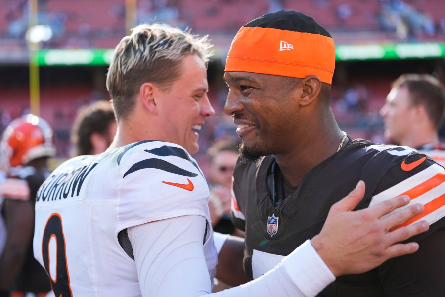 Cincinnati Bengals quarterback Joe Burrow (9) greets Cleveland Browns quarterback Jameis Winston (5) after an NFL football game, Sunday, Oct. 20, 2024, in Cleveland. The Bengals won 21-14. (AP Photo/Sue Ogrocki)