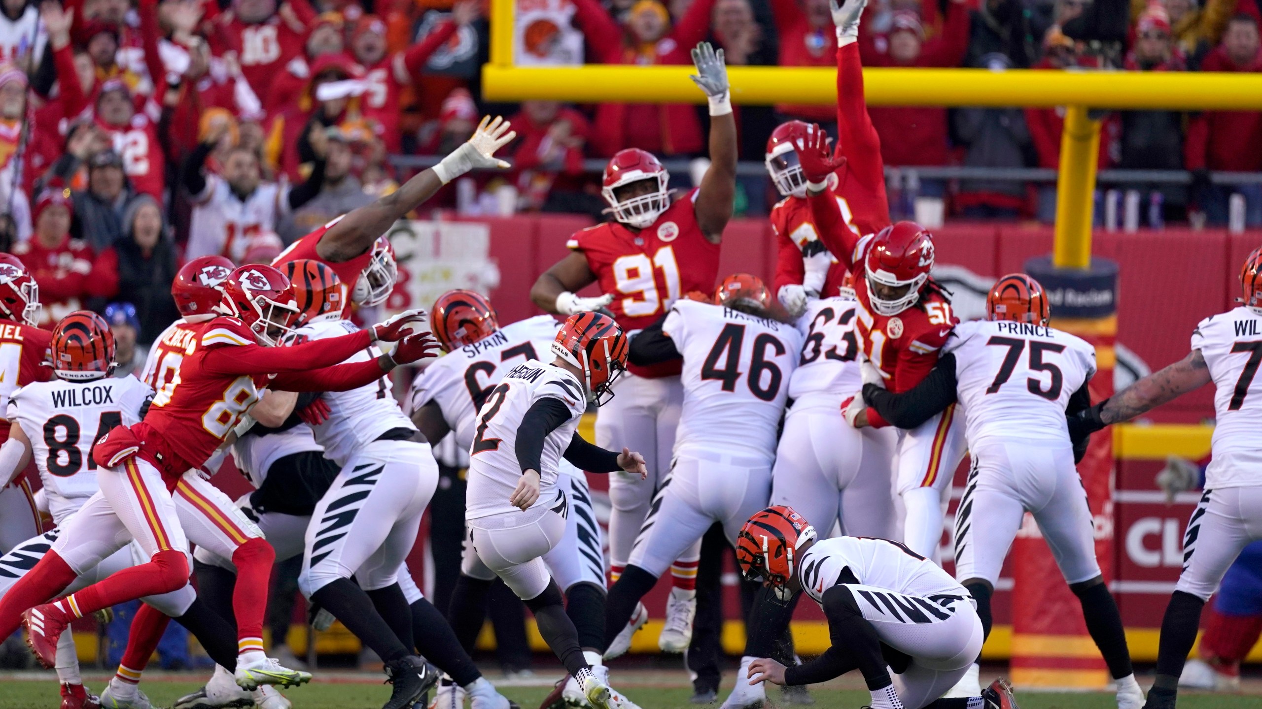 The Bengals erased an 18-point deficit — tying an AFC title game record — to take a late 24-21 lead on an Evan McPherson 52-yard field goal. But Harrison Butker’s 44-yard field goal as time expired in regulation sent it to overtime a week after his 49-yarder on the final play of regulation did the same against Buffalo.