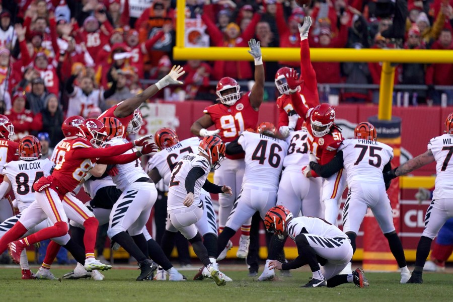 The Bengals erased an 18-point deficit — tying an AFC title game record — to take a late 24-21 lead on an Evan McPherson 52-yard field goal. But Harrison Butker’s 44-yard field goal as time expired in regulation sent it to overtime a week after his 49-yarder on the final play of regulation did the same against Buffalo.