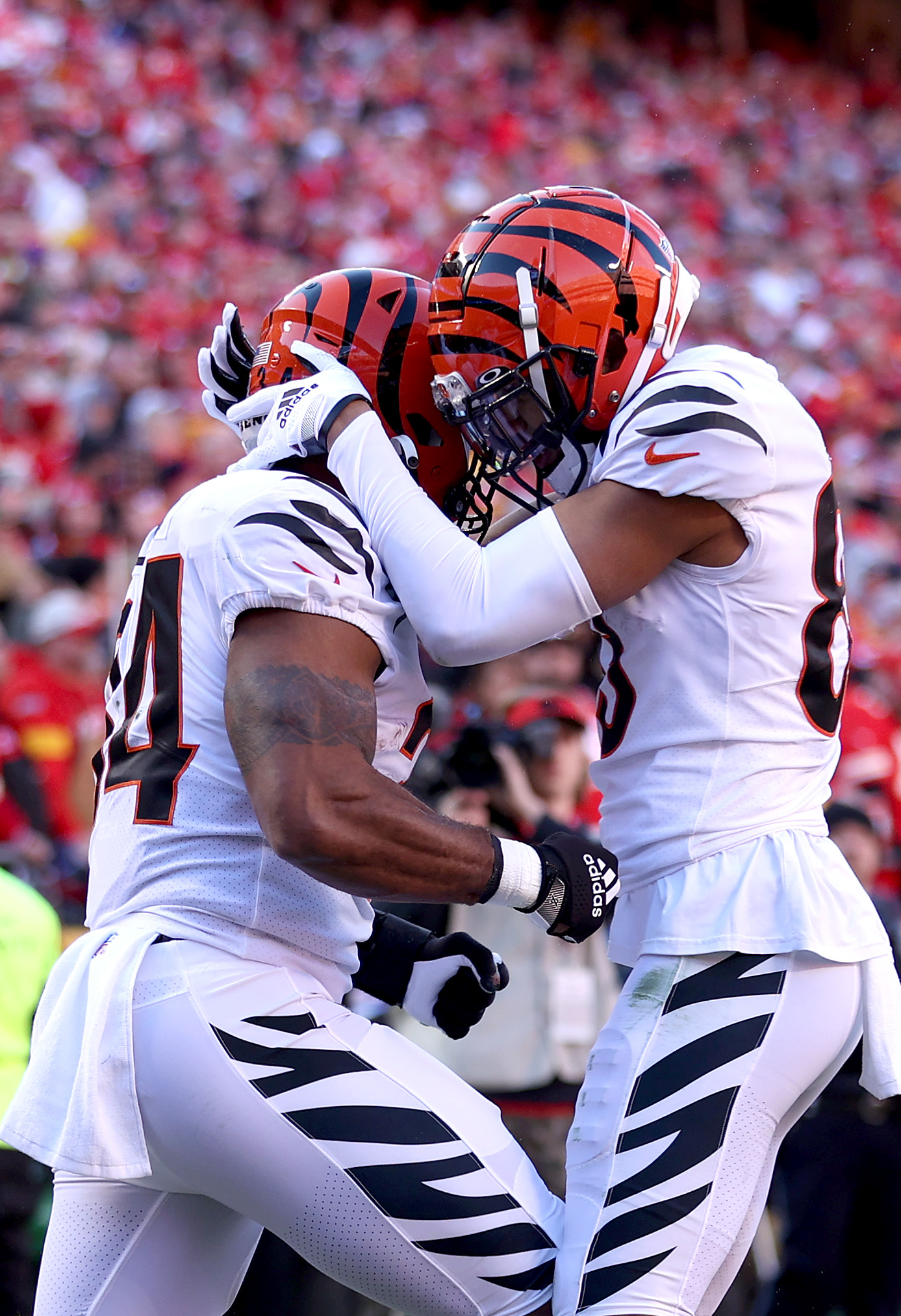 KANSAS CITY, MISSOURI – JANUARY 30: Running back Samaje Perine #34 of the Cincinnati Bengals celebrates with wide receiver Tee Higgins #85 after rushing for a second quarter touchdown against the Kansas City Chiefs in the AFC Championship Game at Arrowhead Stadium on January 30, 2022 in Kansas City, Missouri. (Photo by Jamie Squire/Getty Images)