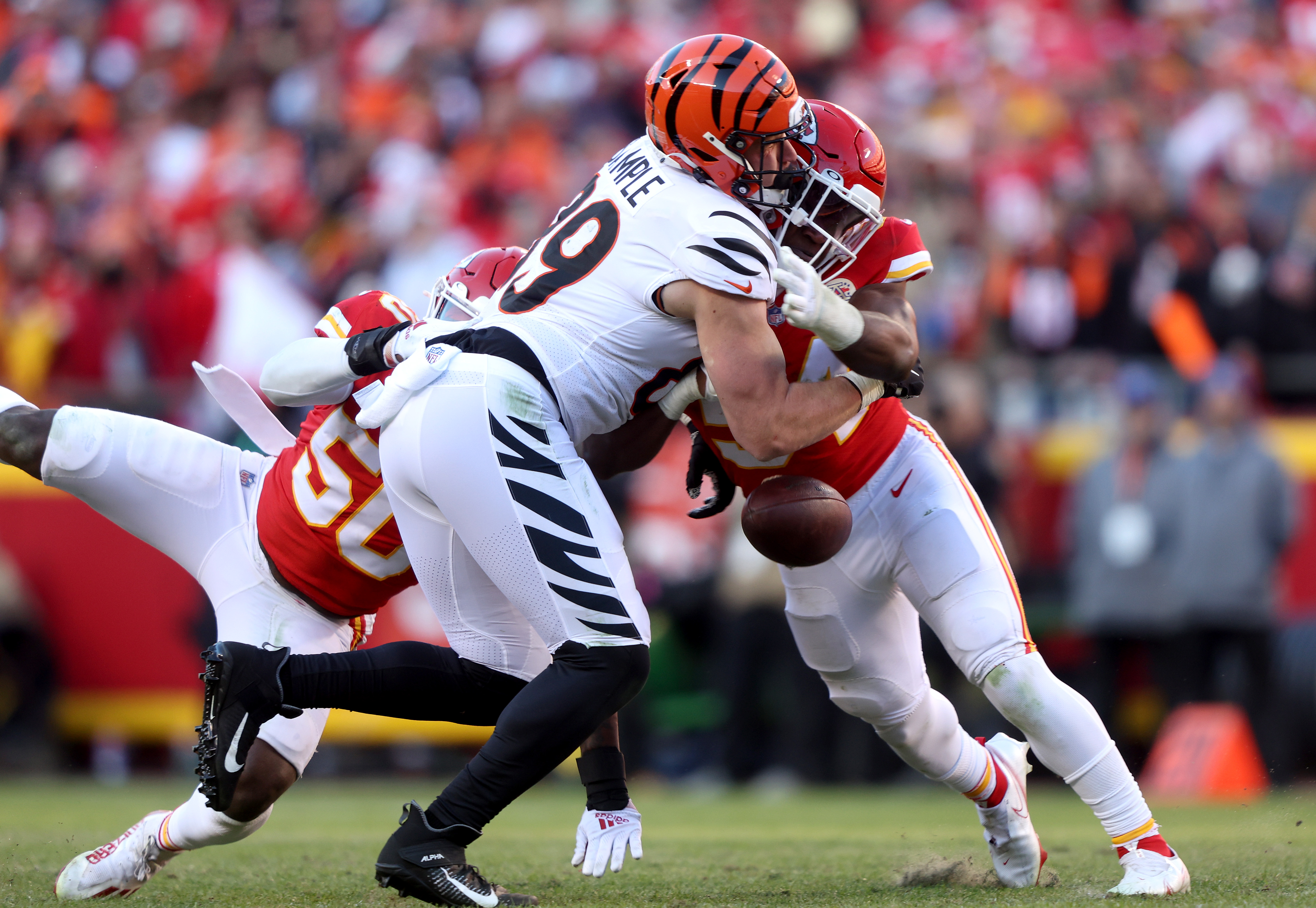KANSAS CITY, MISSOURI – JANUARY 30: Outside linebacker Nick Bolton #54 of the Kansas City Chiefs breaks up a pass intended for tight end Drew Sample #89 of the Cincinnati Bengals during the third quarter in the AFC Championship Game at Arrowhead Stadium on January 30, 2022 in Kansas City, Missouri. (Photo by Jamie Squire/Getty Images)