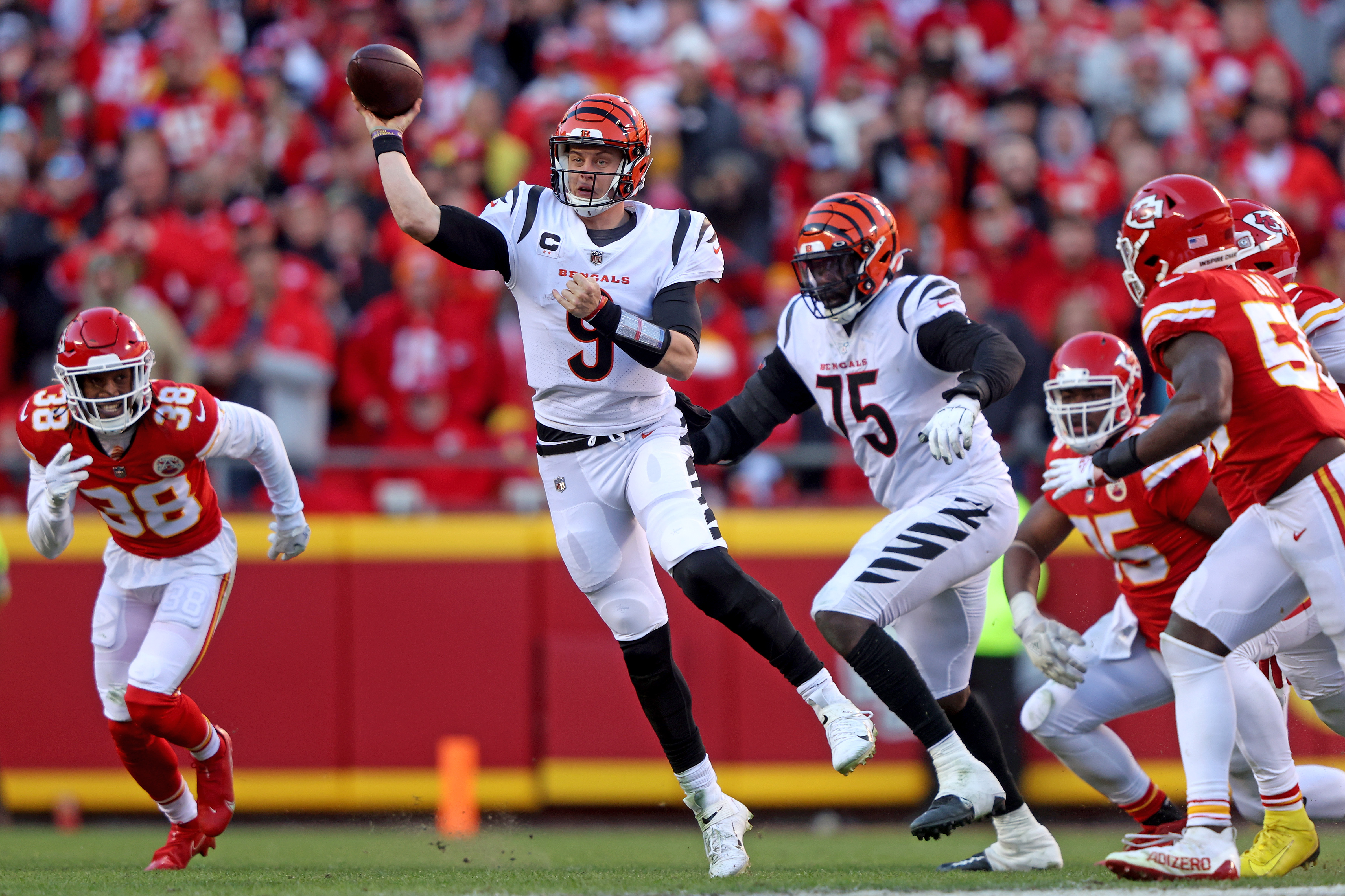 KANSAS CITY, MISSOURI – JANUARY 30: Quarterback Joe Burrow #9 of the Cincinnati Bengals throws the ball against the Kansas City Chiefs in third quarter in the AFC Championship Game at Arrowhead Stadium on January 30, 2022 in Kansas City, Missouri. (Photo by Jamie Squire/Getty Images)