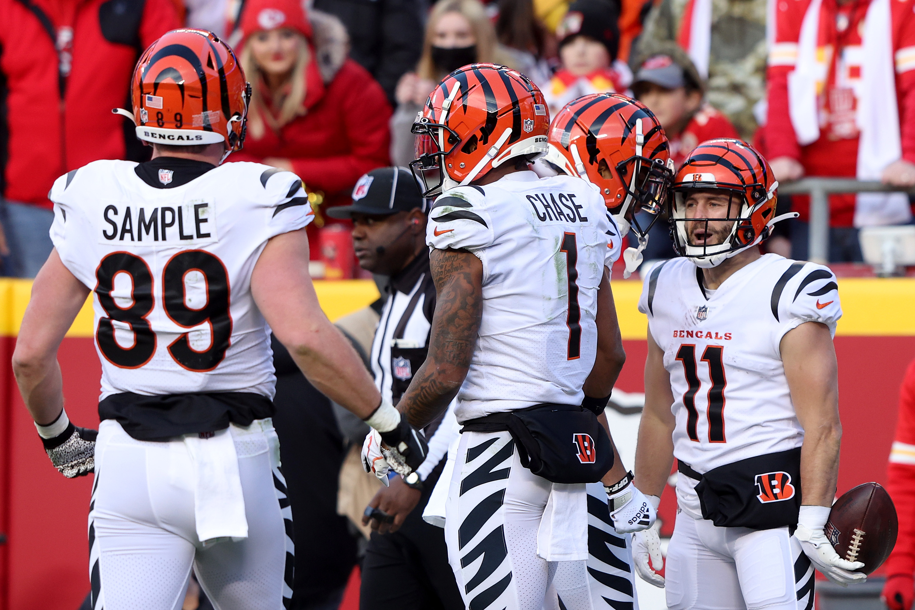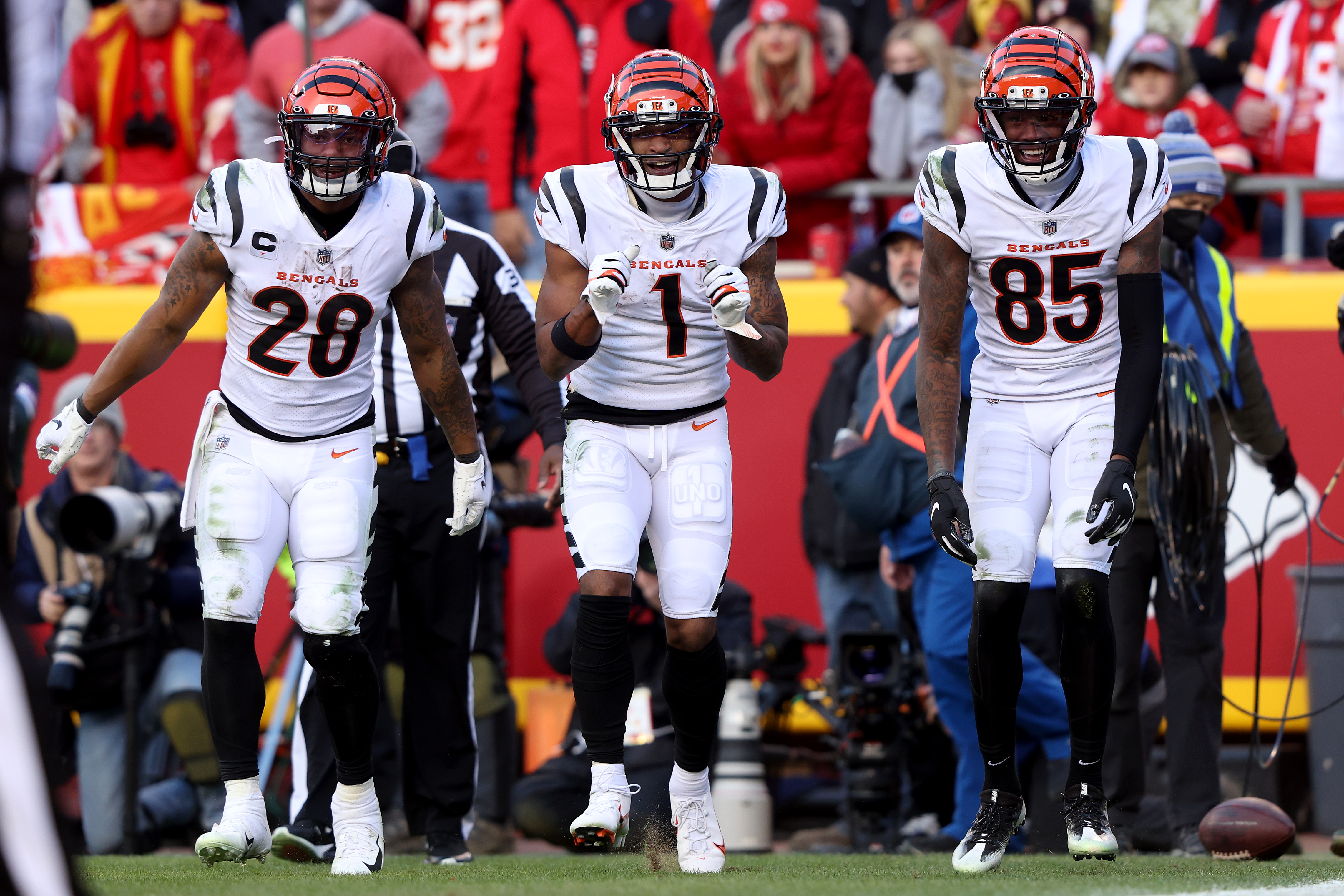 KANSAS CITY, MISSOURI – JANUARY 30: Wide receiver Ja’Marr Chase #1 of the Cincinnati Bengals celebrates with running back Joe Mixon #28 and wide receiver Tee Higgins #85 after catching a third quarter touchdown pass against the Kansas City Chiefs in the AFC Championship Game at Arrowhead Stadium on January 30, 2022 in Kansas City, Missouri. (Photo by Jamie Squire/Getty Images)