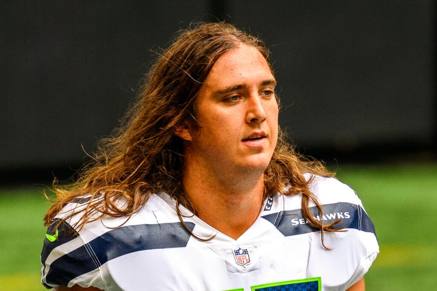 FILE - Seattle Seahawks offensive tackle Chad Wheeler (75) is shown before an NFL football game against the Atlanta Falcons in Atlanta, in this Sunday, Sept. 13, 2020, file photo. The Seattle Seahawks said Wednesday, Jan. 27, 2021, that offensive lineman Chad Wheeler is no longer a member of the team following his arrest last weekend for investigation of domestic violence. (AP Photo/Danny Karnik, File)