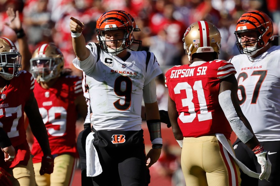 Cincinnati Bengals quarterback Joe Burrow (9) gestures during the first half of an NFL football game against the San Francisco 49ers in Santa Clara, Calif., Sunday, Oct. 29, 2023. (AP Photo/Josie Lepe)