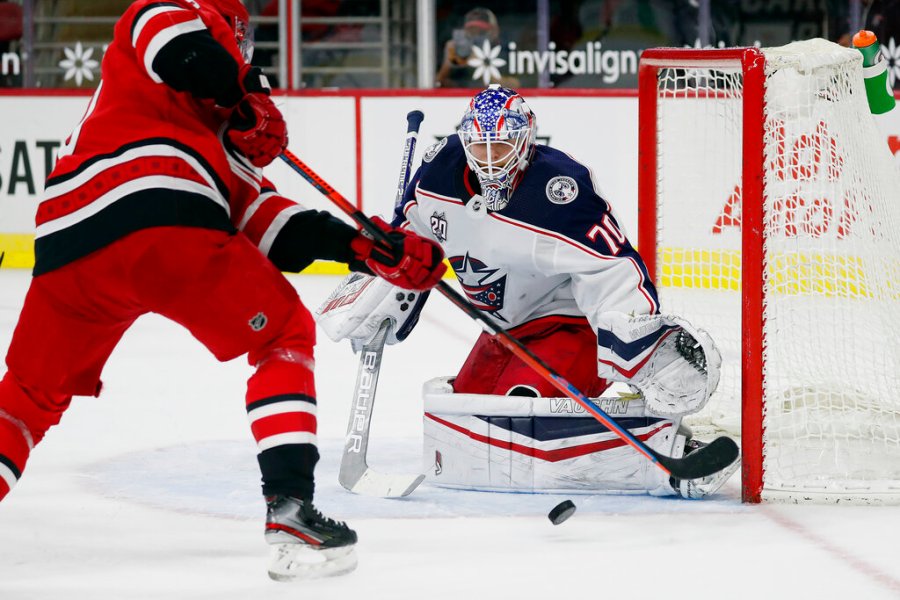 Columbus Blue Jackets goaltender Joonas Korpisalo (70) eyes the shot of Carolina Hurricanes' Cedric Paquette (18) during the second period of an NHL hockey game in Raleigh, N.C., Monday, Feb. 15, 2021. (AP Photo/Karl B DeBlaker)