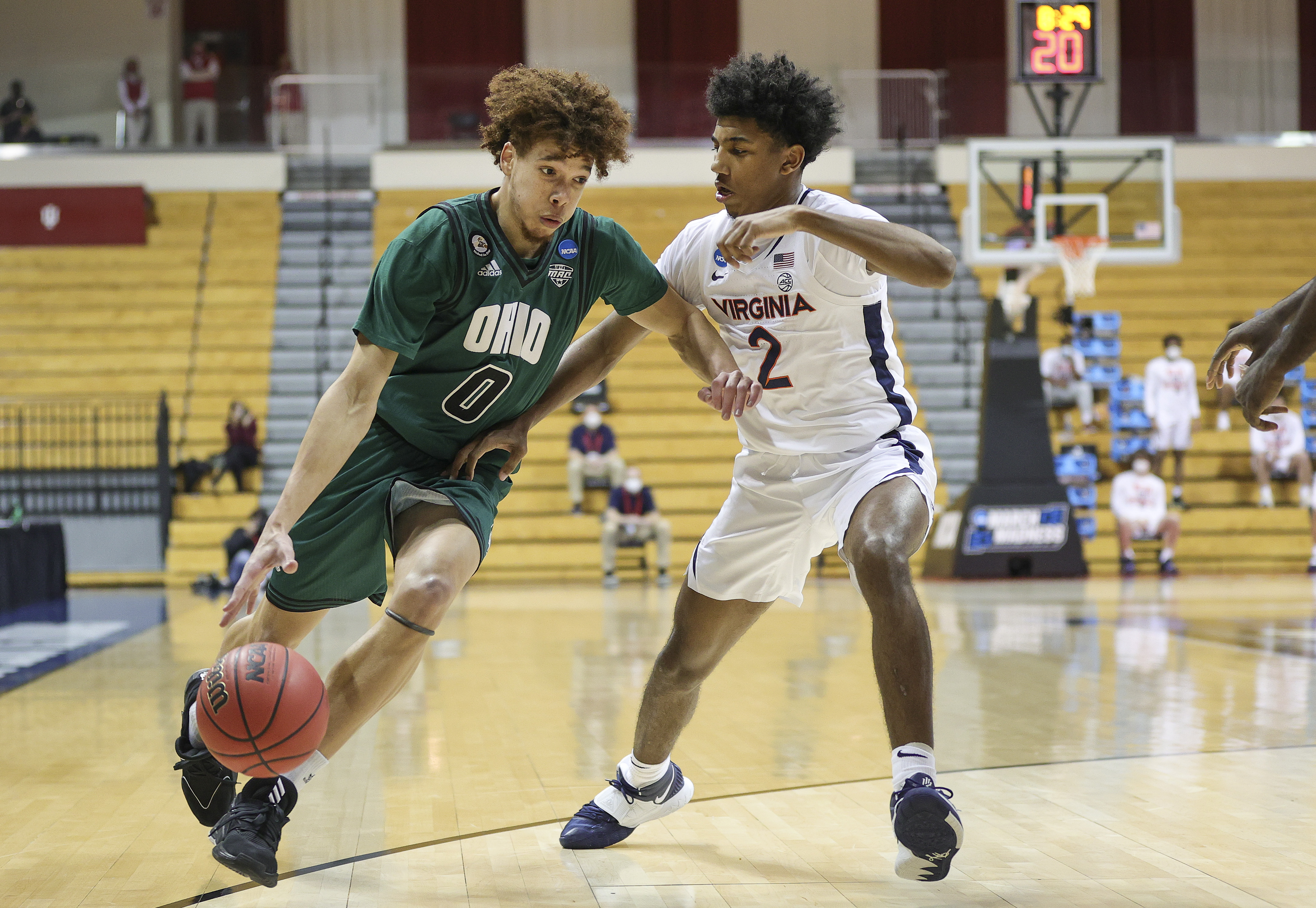 BLOOMINGTON, INDIANA – MARCH 20: Jason Preston #0 of the Ohio Bobcats handles the ball defended by Reece Beekman #2 of the Virginia Cavaliers in the first round game of the 2021 NCAA Men’s Basketball Tournament at Assembly Hall on March 20, 2021 in Bloomington, Indiana. (Photo by Stacy Revere/Getty Images)