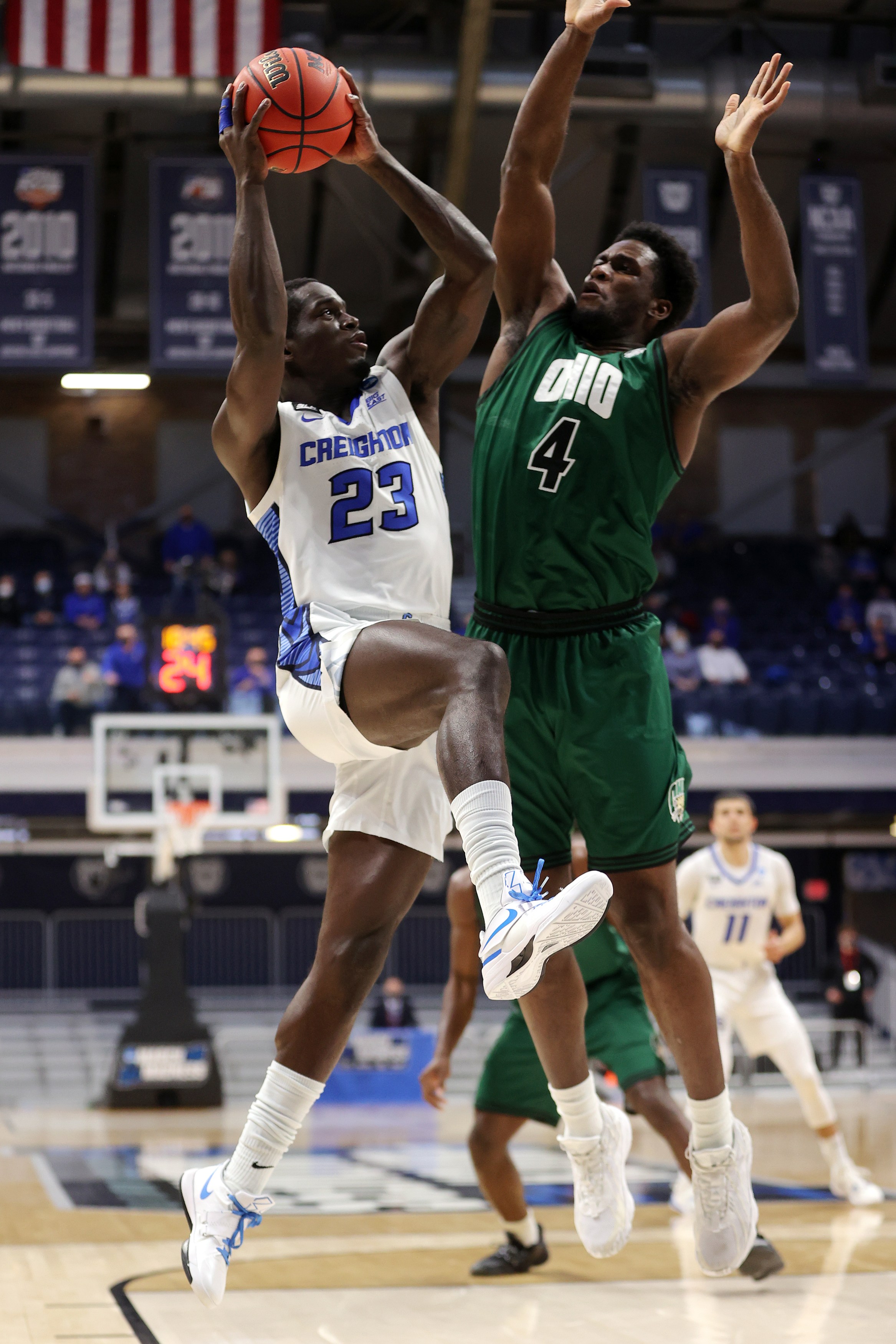 INDIANAPOLIS, INDIANA – MARCH 22: Damien Jefferson #23 of the Creighton Bluejays goes up for a shot against Dwight Wilson III #4 of the Ohio Bobcats in the first half of their second round game of the 2021 NCAA Men’s Basketball Tournament at Hinkle Fieldhouse on March 22, 2021 in Indianapolis, Indiana. (Photo by Gregory Shamus/Getty Images)