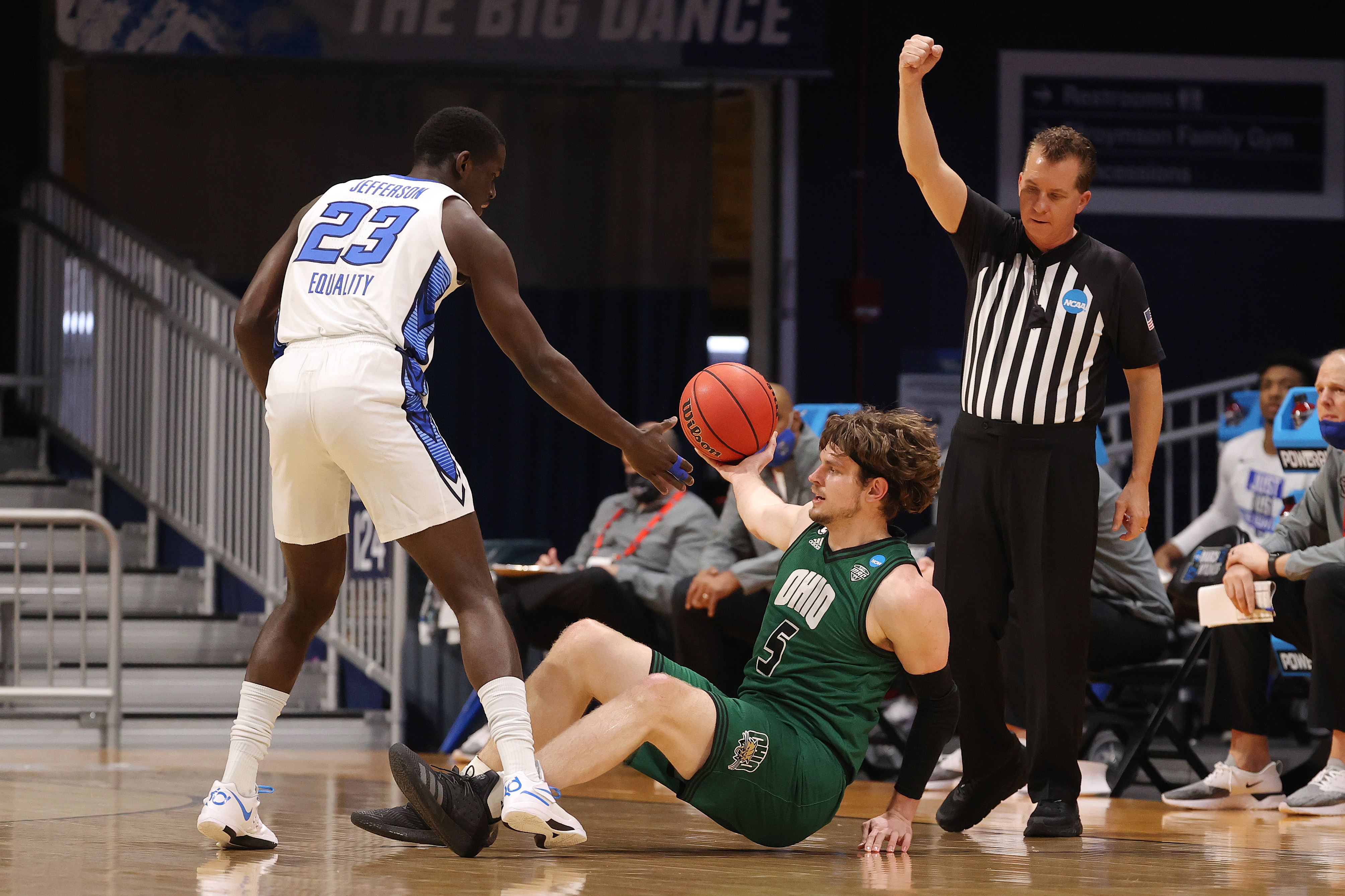 INDIANAPOLIS, INDIANA – MARCH 22: Ben Vander Plas #5 of the Ohio Bobcats is fouled in the first half of their second round game against the Creighton Bluejays in the 2021 NCAA Men’s Basketball Tournament at Hinkle Fieldhouse on March 22, 2021 in Indianapolis, Indiana. (Photo by Gregory Shamus/Getty Images)