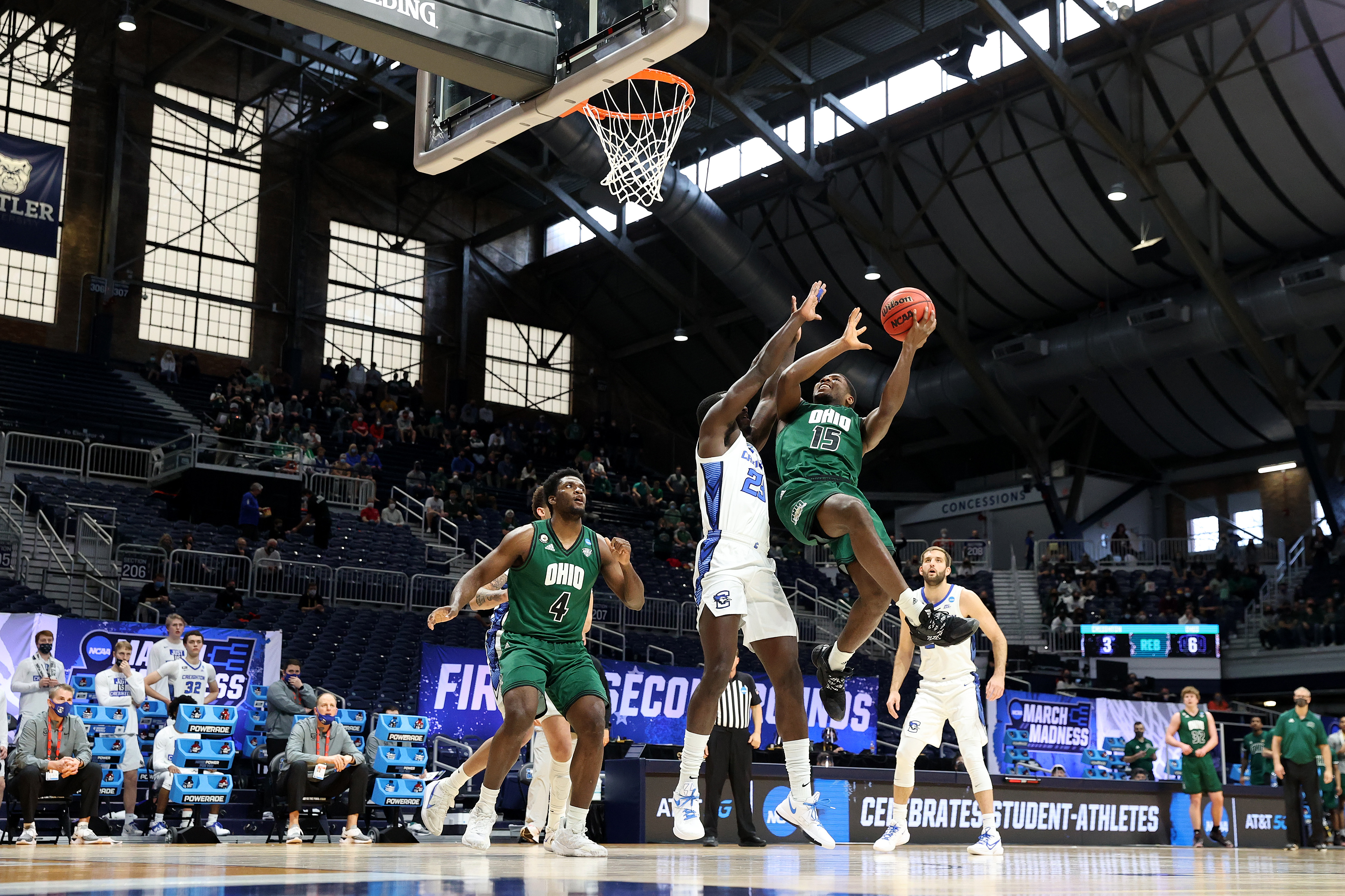 INDIANAPOLIS, INDIANA – MARCH 22: Jason Preston #0 of the Ohio Bobcats goes up for a shot against Christian Bishop #13 of the Creighton Bluejays in the first half of their second round game of the 2021 NCAA Men’s Basketball Tournament at Hinkle Fieldhouse on March 22, 2021 in Indianapolis, Indiana. (Photo by Andy Lyons/Getty Images)